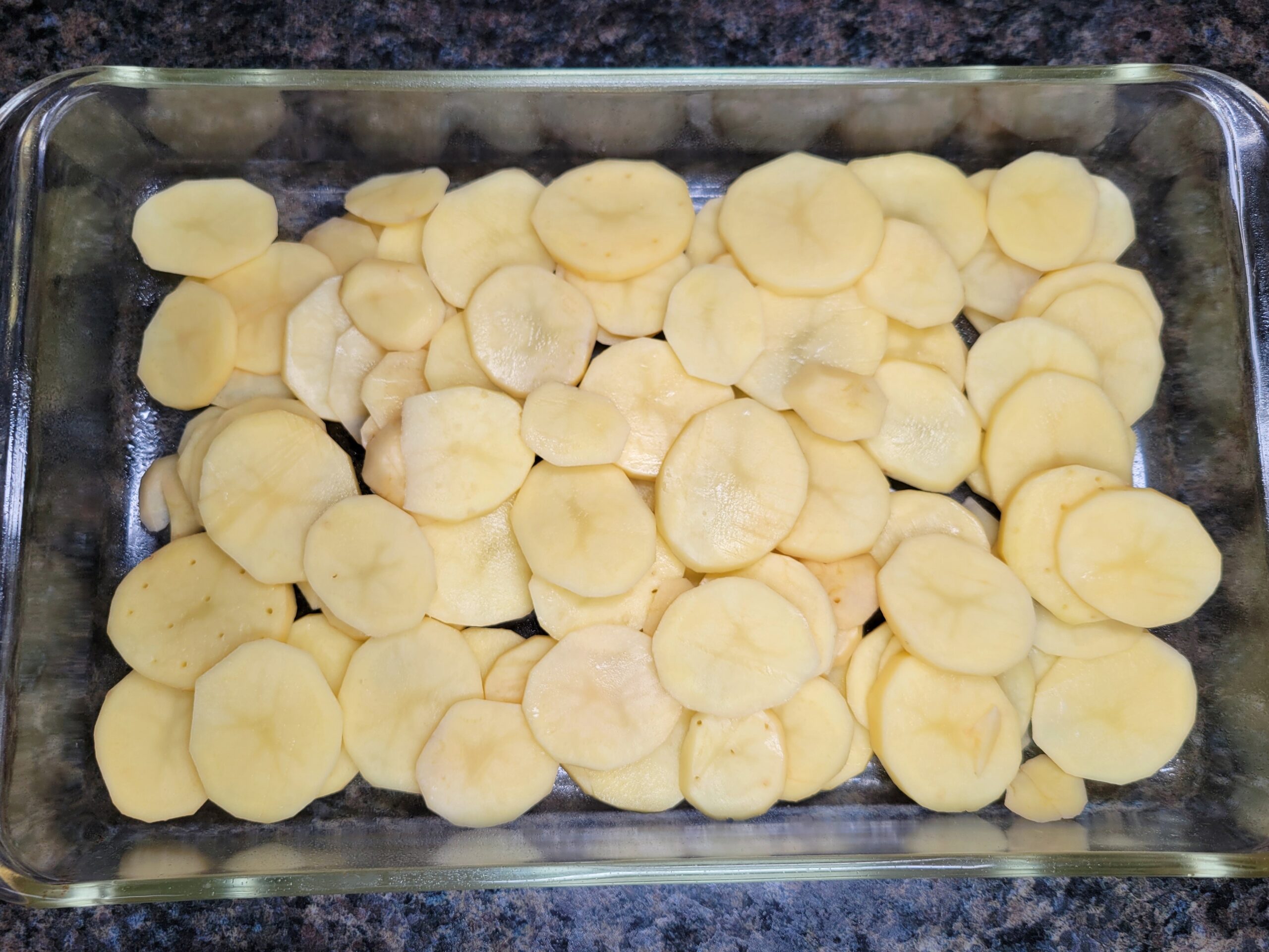 Layer half of the sliced potatoes evenly in the bottom of a 3-quart, 9x13-inch baking dish.