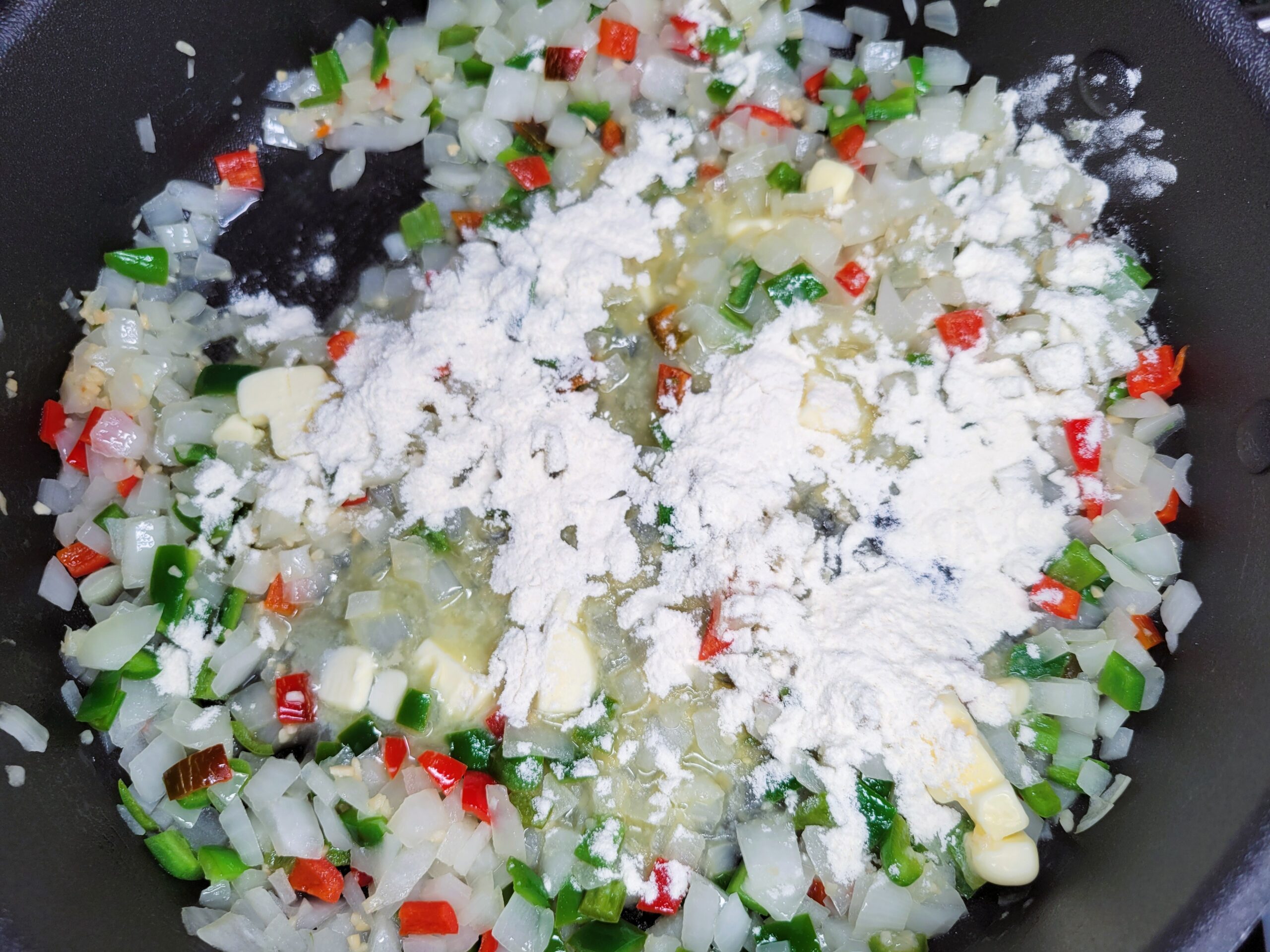 To prepare the sauce, finely chop 1 medium yellow onion. Heat a skillet over medium heat, add 1 tablespoon of butter, then toss in the onions and jalapeƱos, sautƩing until they are slightly softened. Add in remaining 4 tablespoons of butter and 3 tablespoons of flour, cooking for 2-3 minutes.