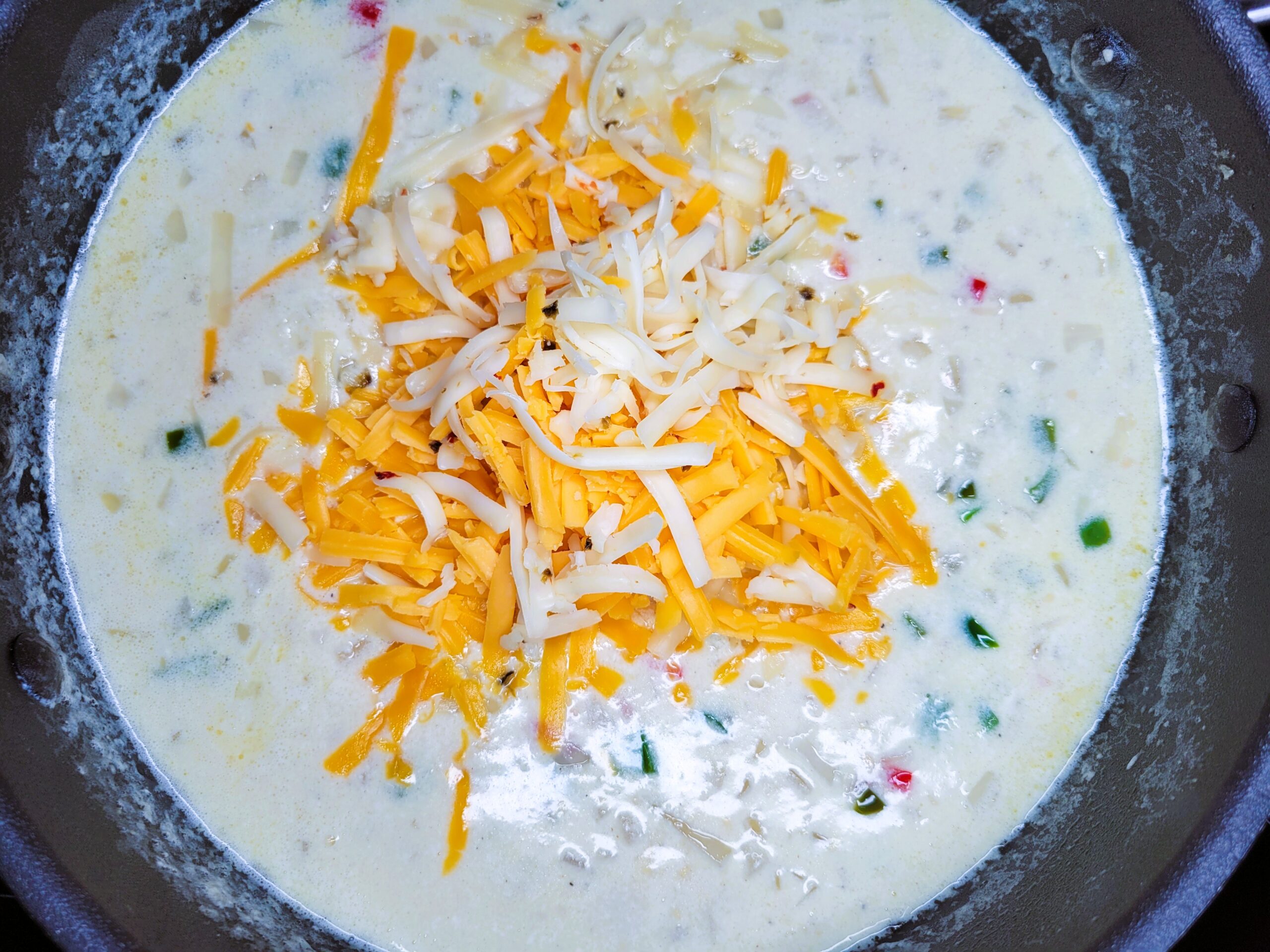 Once the sauce begins to thicken, stir in 3/4 cup of shredded sharp cheddar cheese and 3/4 cup of shredded pepper jack cheese, stirring until melted. Remove from heat.