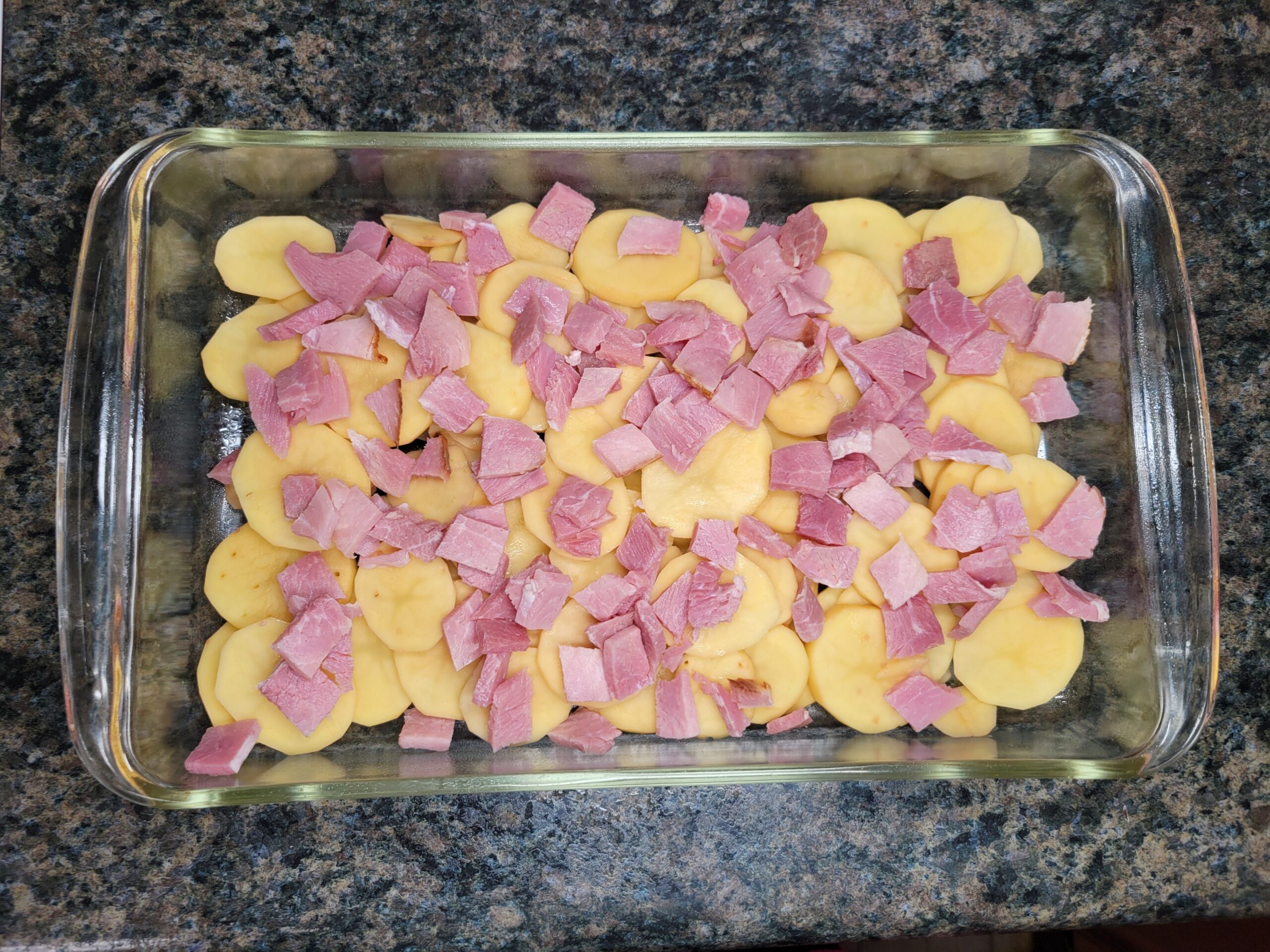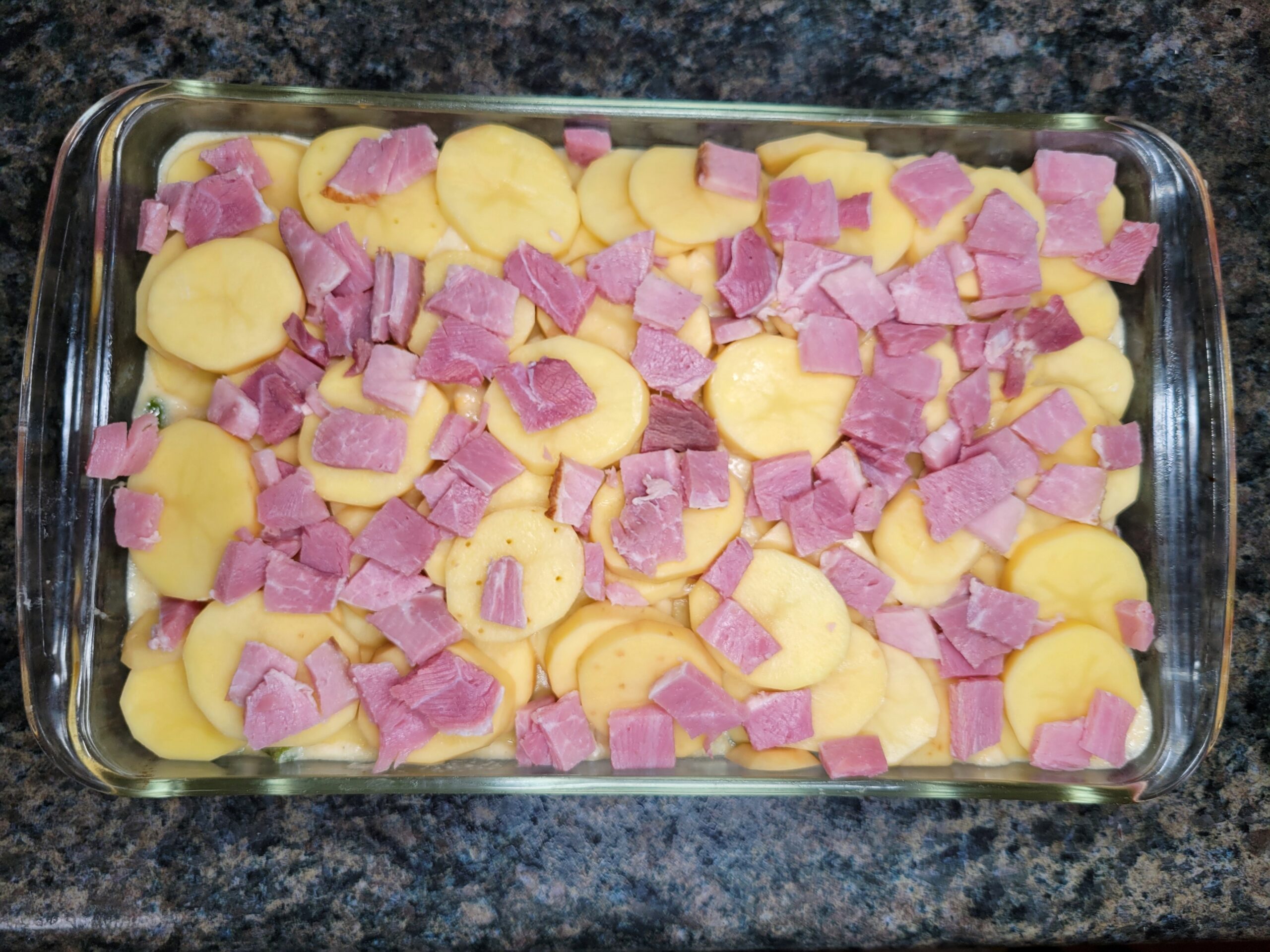 Repeat the process: Layer the remaining potatoes over the sauce and sprinkle with the remaining ham.