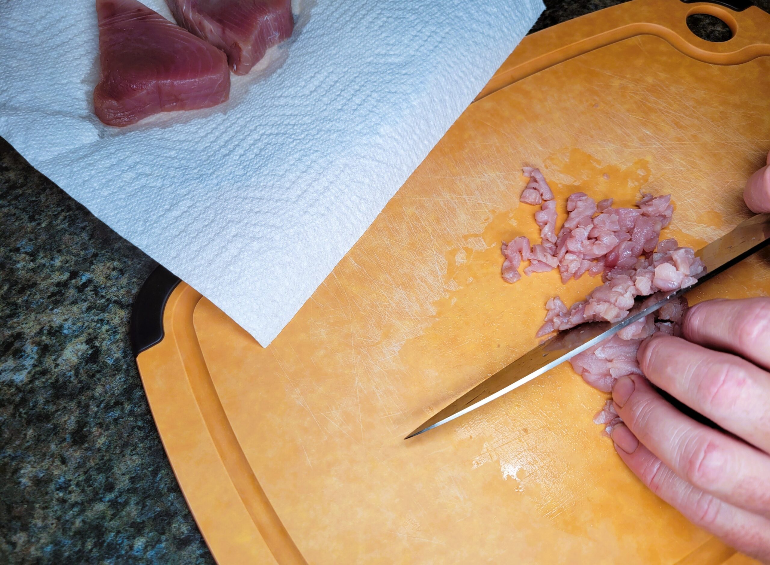 Pat the tuna dry with a paper towel, then finely mince it and transfer it to a medium-sized bowl.