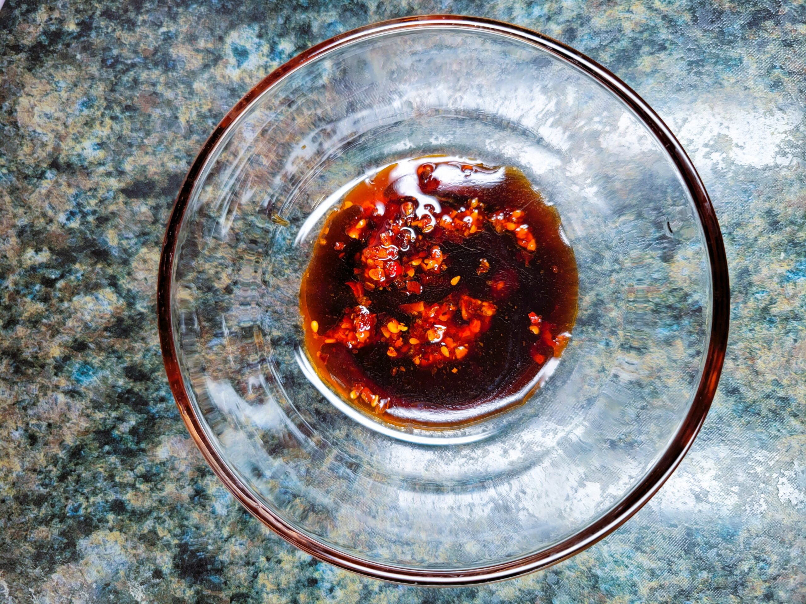 In a small bowl, mix 1 teaspoon of chili crunch or chili oil, 1/4 teaspoon of sesame oil, and 2 teaspoons of soy sauce.