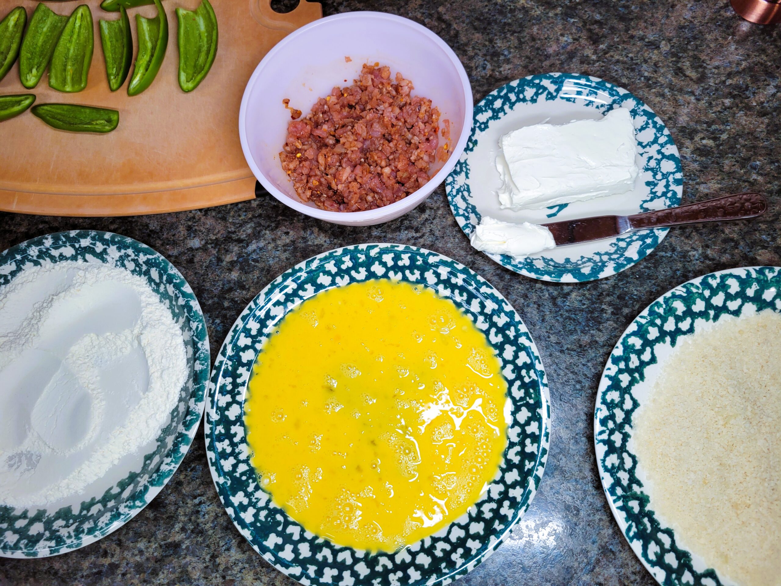 Prepare your Jalapeno Tuna Bomb making station. Add 2/3 cup of all-purpose flour to a shallow dish. Beat 3 eggs and pour them into another shallow dish, and place 3/4 cup of panko in its own separate shallow dish. Cream cheese should be at room temperature to make it easier to work with.