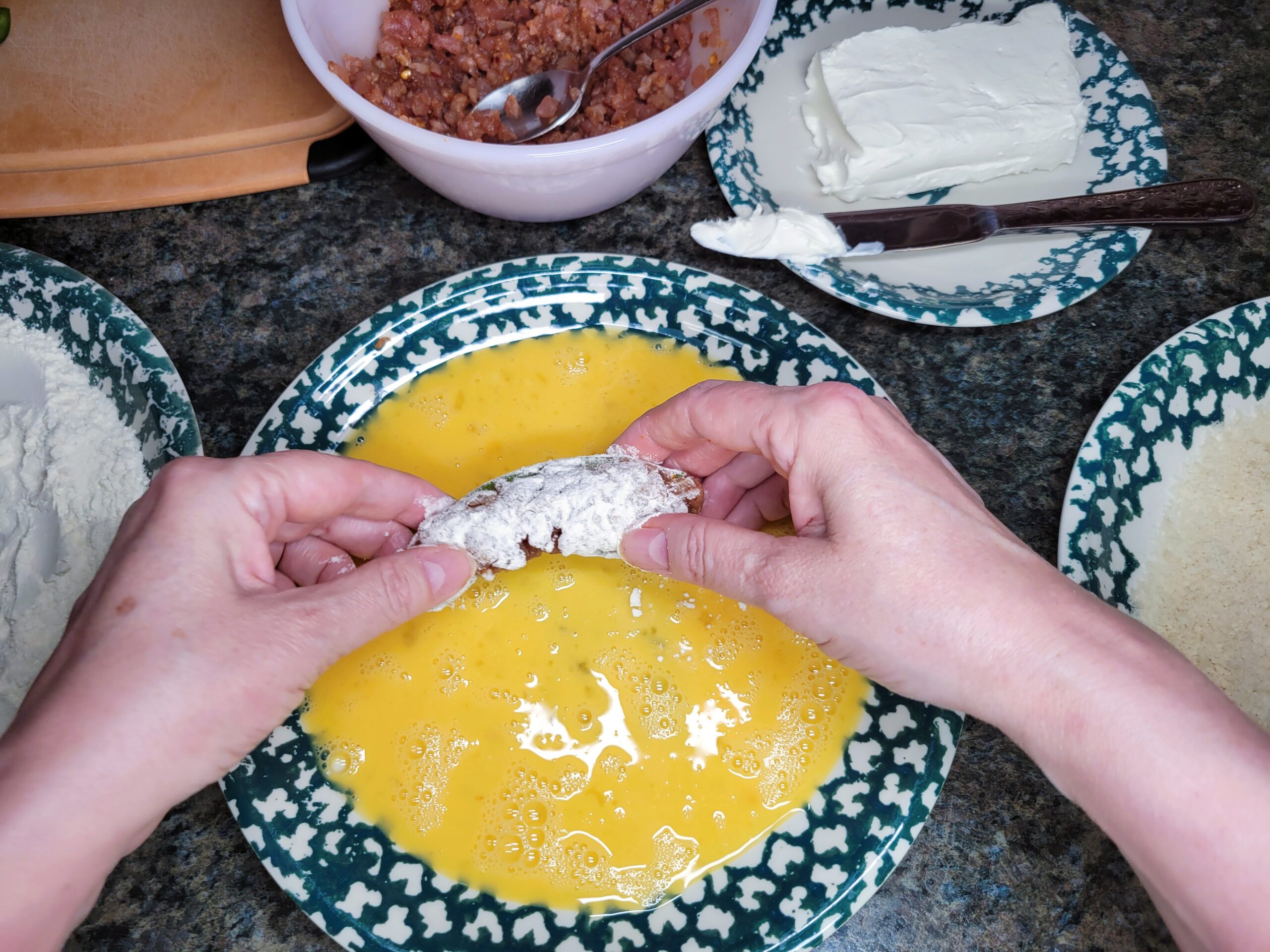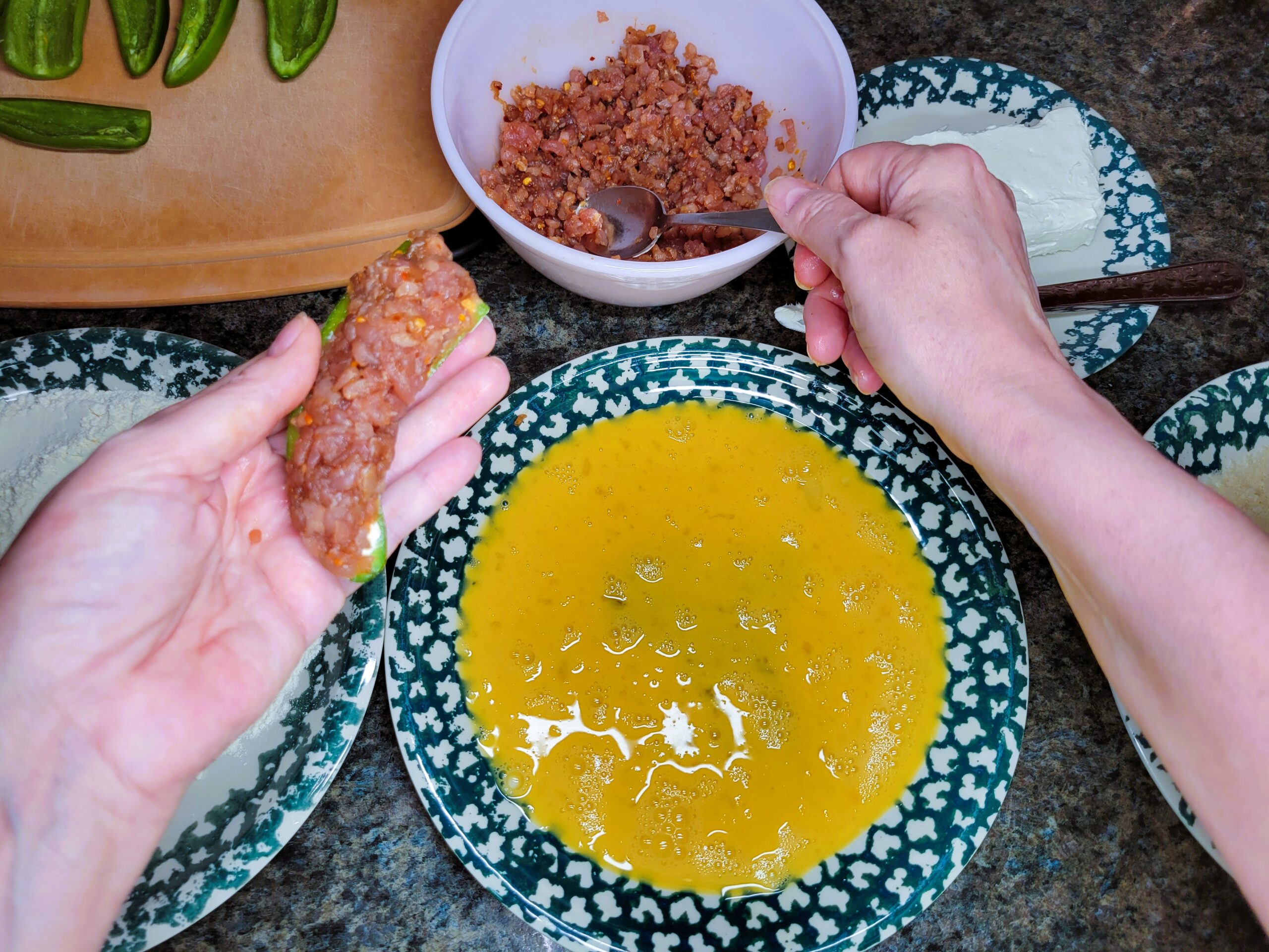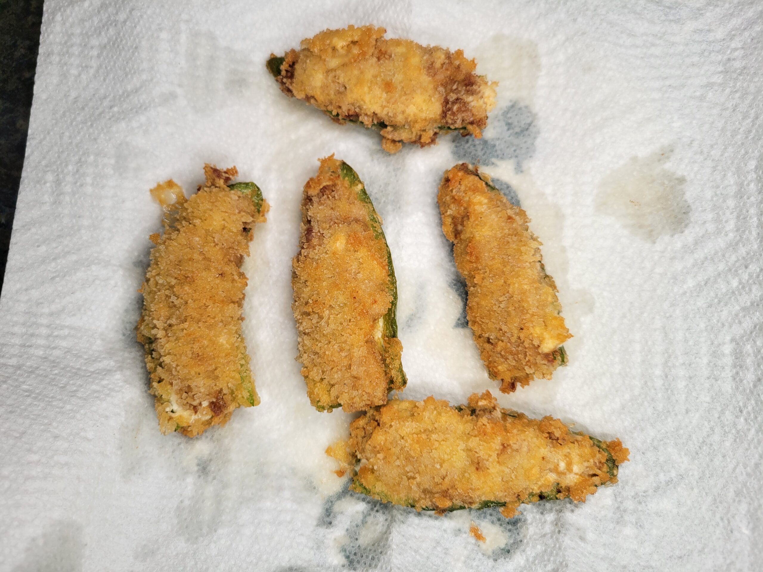 Preheat a frying pan with canola or vegetable oil to 350°F. Begin by spreading cream cheese into the jalapeños.