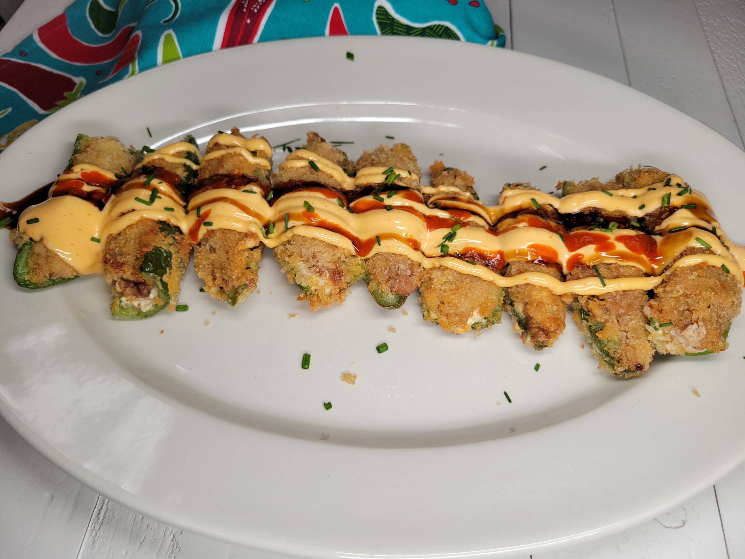 JalapeƱos stuffed with cream cheese and spicy tuna, breaded with Panko breadcrumbs and fried, then topped with three flavorful sauces. The perfect appetizer!