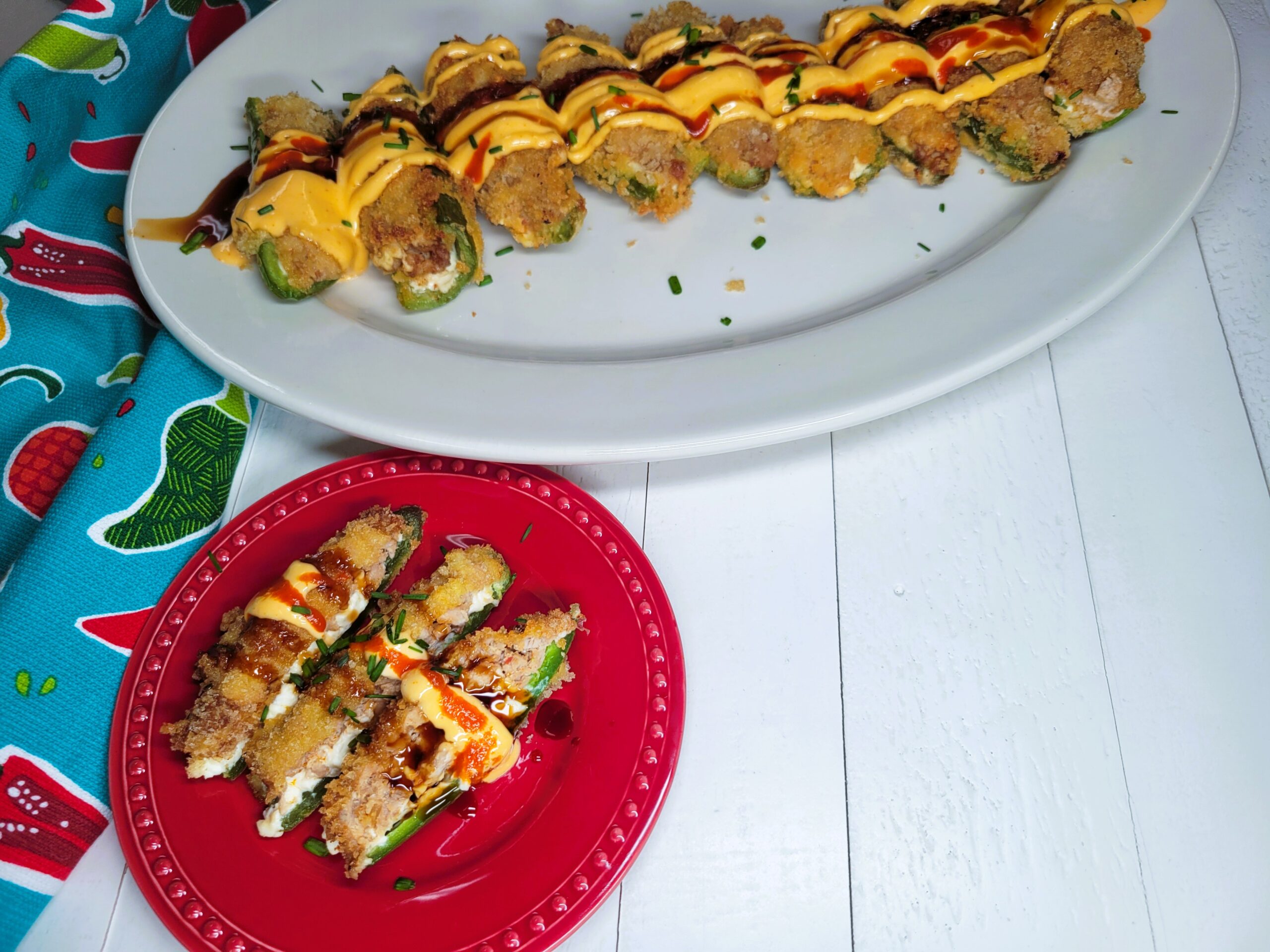 Drizzle Jalapeno Tuna Bombs with a generous amount of spicy mayonnaise, teriyaki sauce, and sriracha. Garnish with freshly chopped chives.