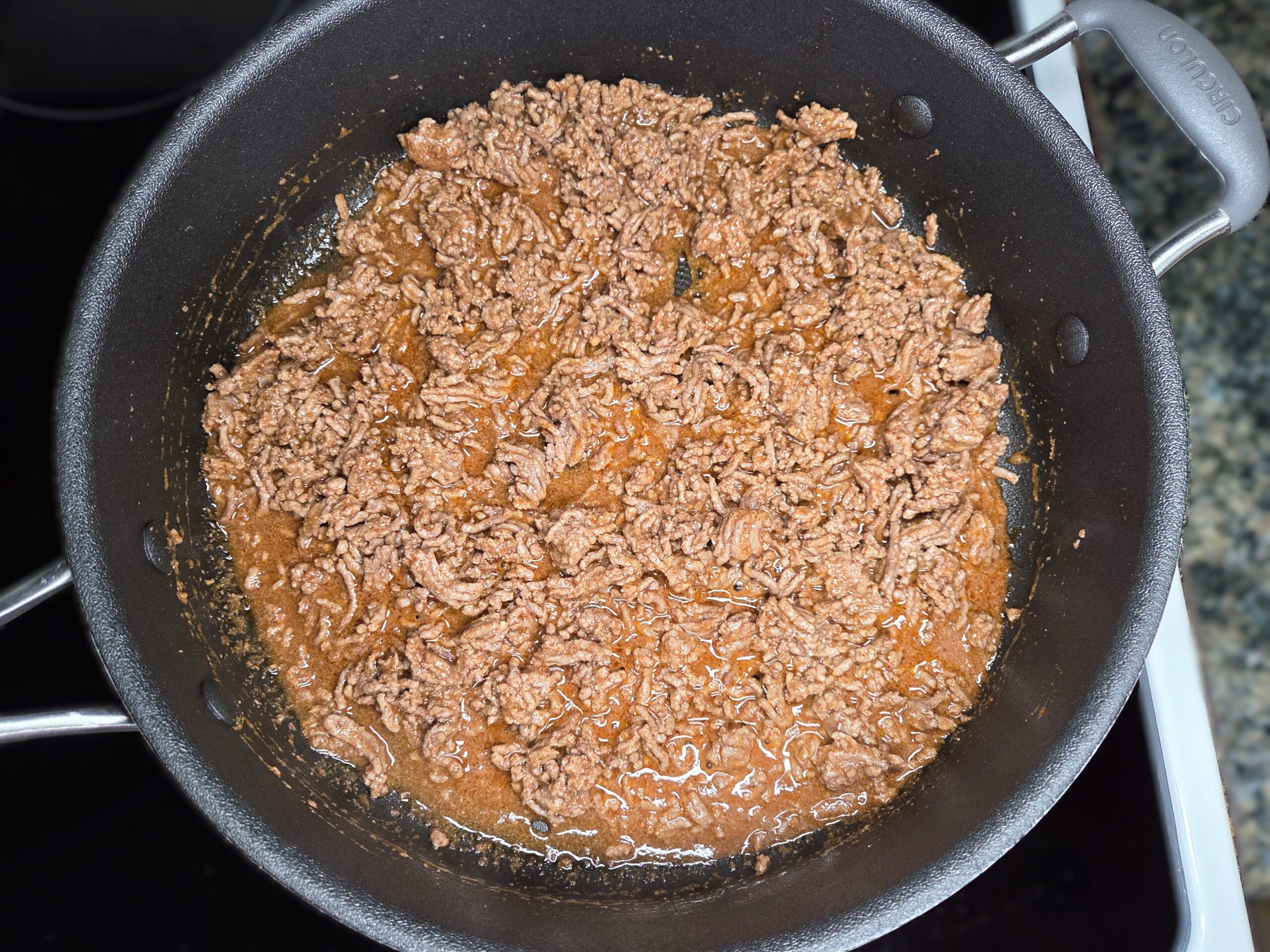 In a large skillet set over medium‑high heat, cook 1 pound of ground beef or any meat you prefer, breaking it apart with a spatula until browned and no longer pink. Add your favorite taco seasoning, or we have a great homemade taco seasoning recipe here: Homemade Taco Seasoning.