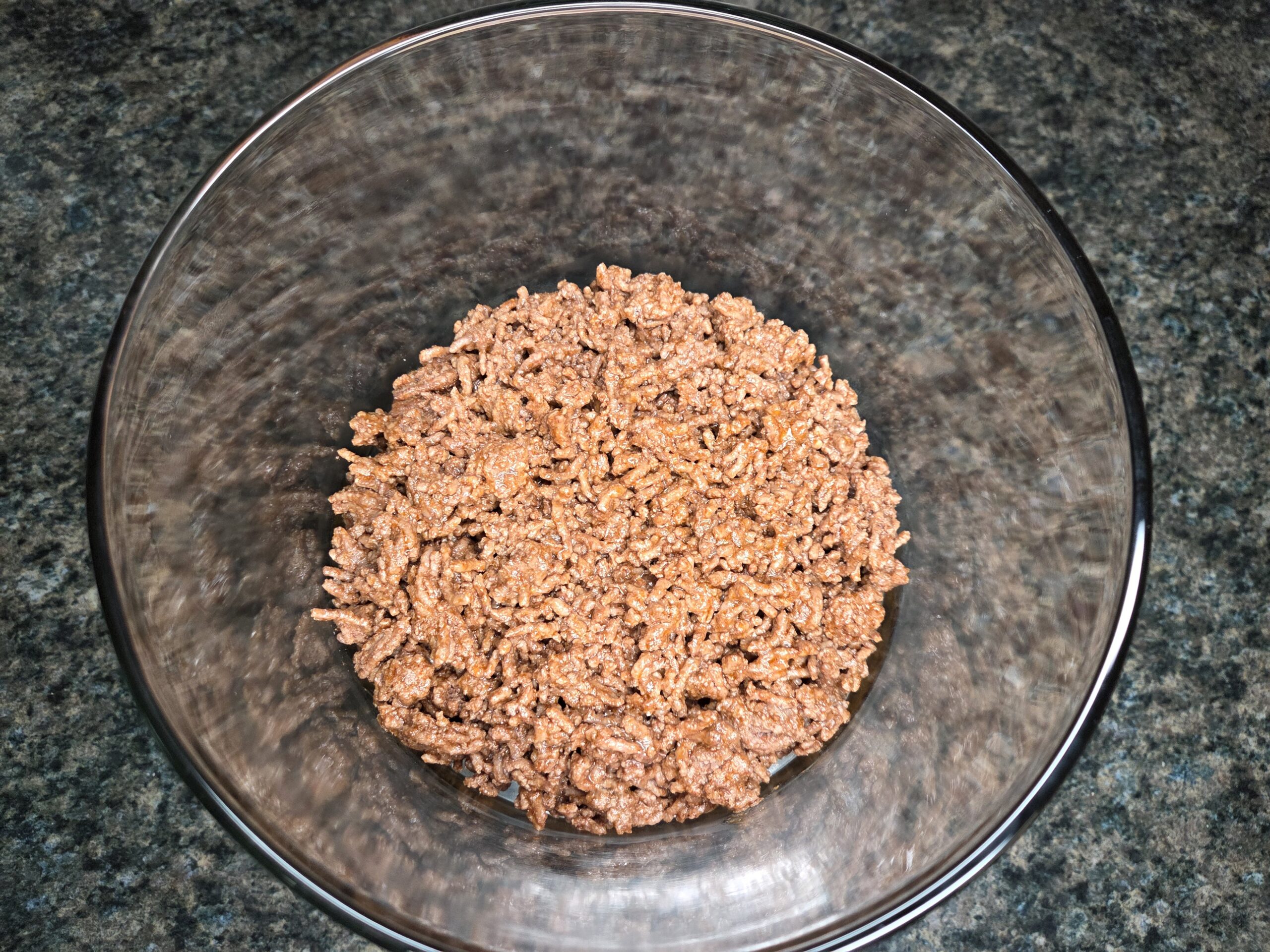 In a 3‑quart dish, spread all of the cooked and cooled taco meat evenly across the bottom to form the first layer.
