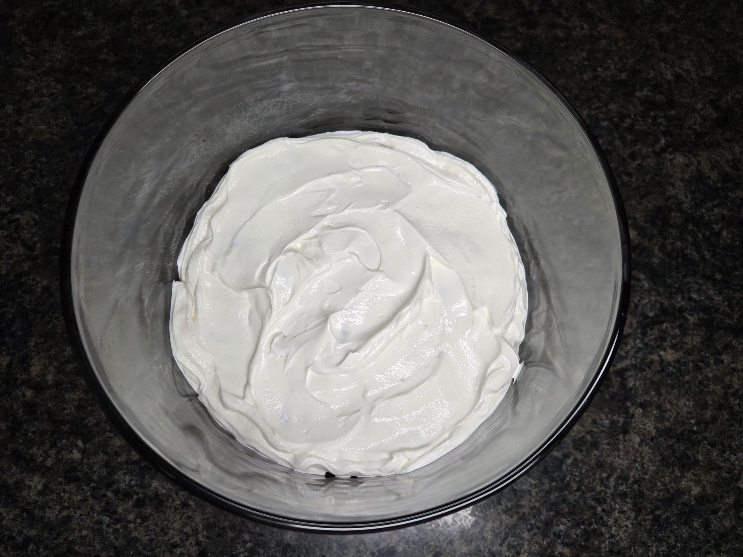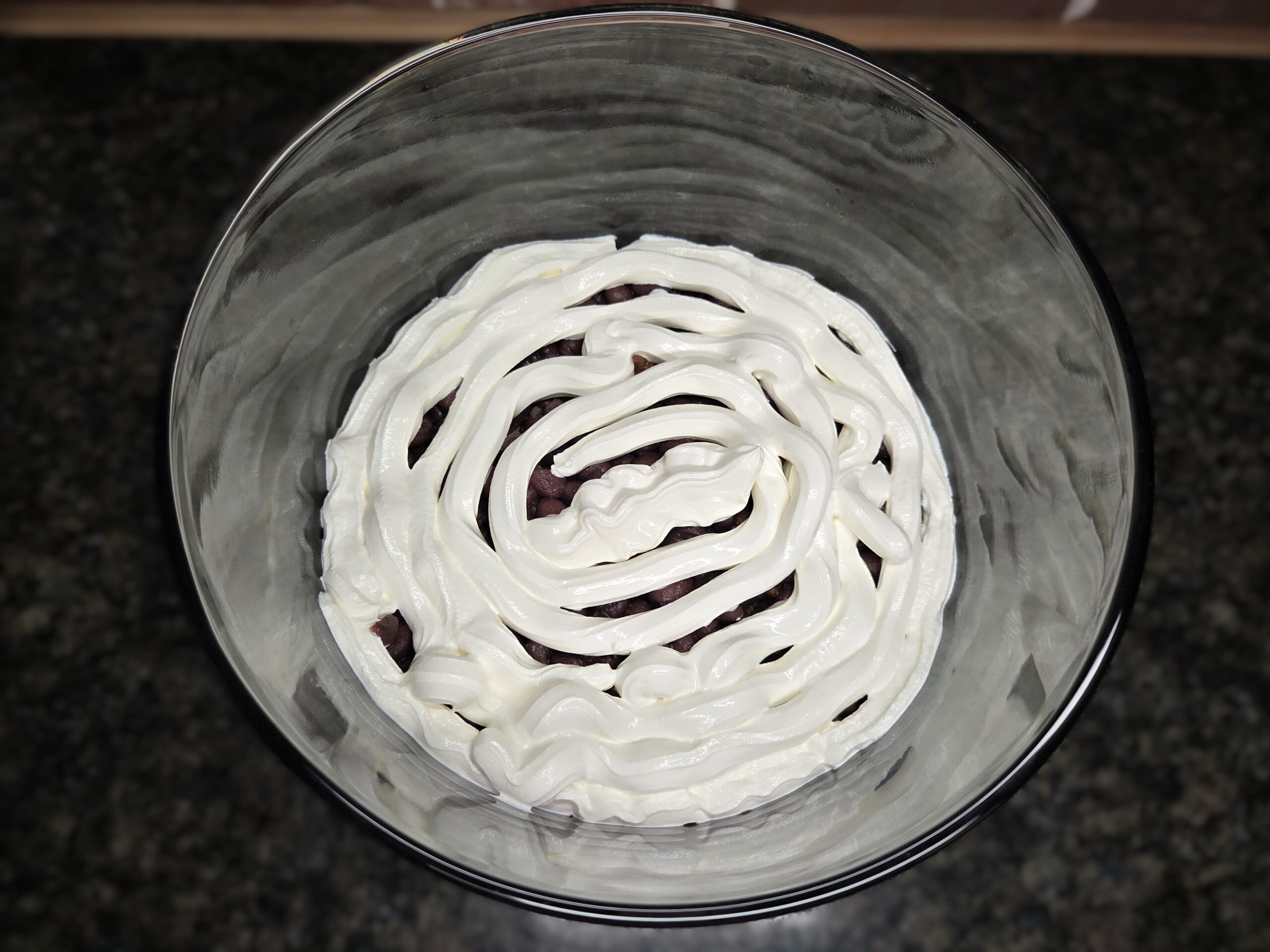 Spread about 10 ounces of sour cream over the black beans to create the third layer. A squeeze‑tube sour cream works especially well for this step because it lets you distribute it evenly; then you can smooth it out gently with the back of a spoon to cover the beans completely.