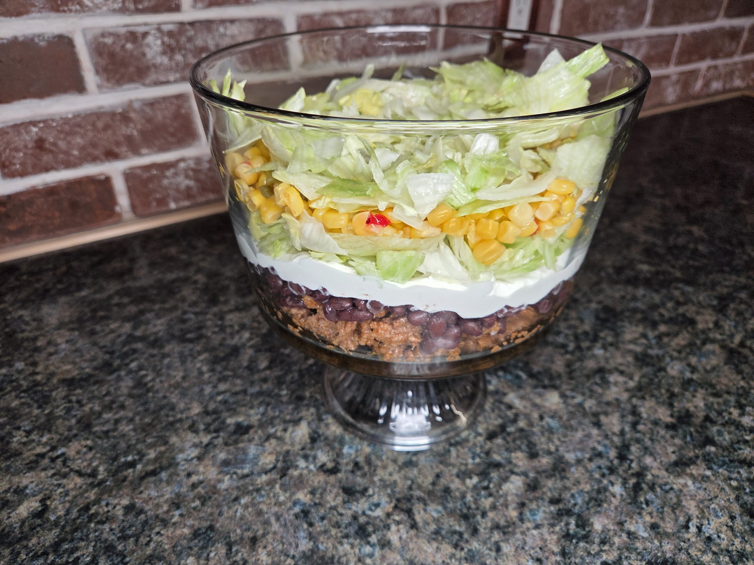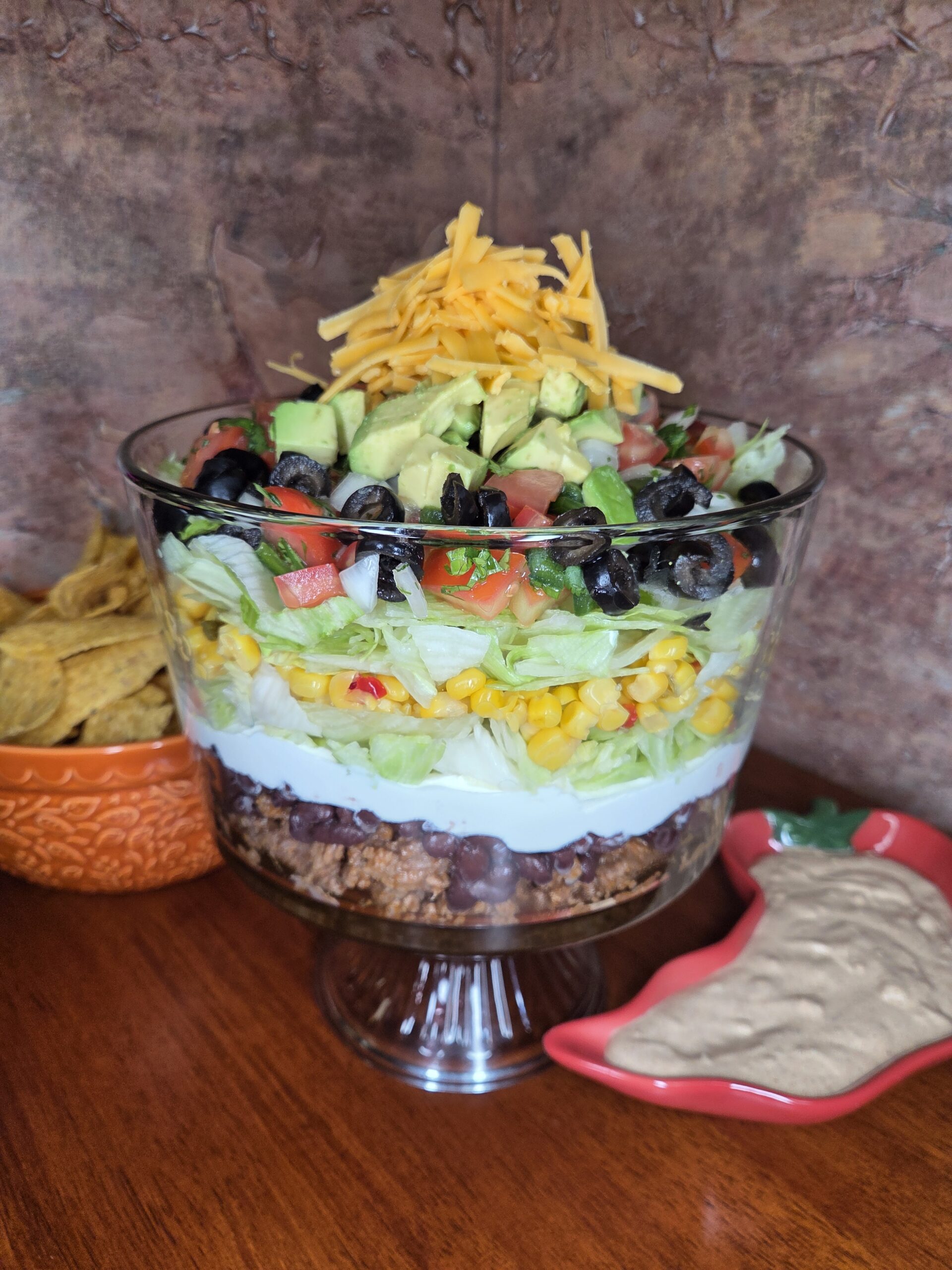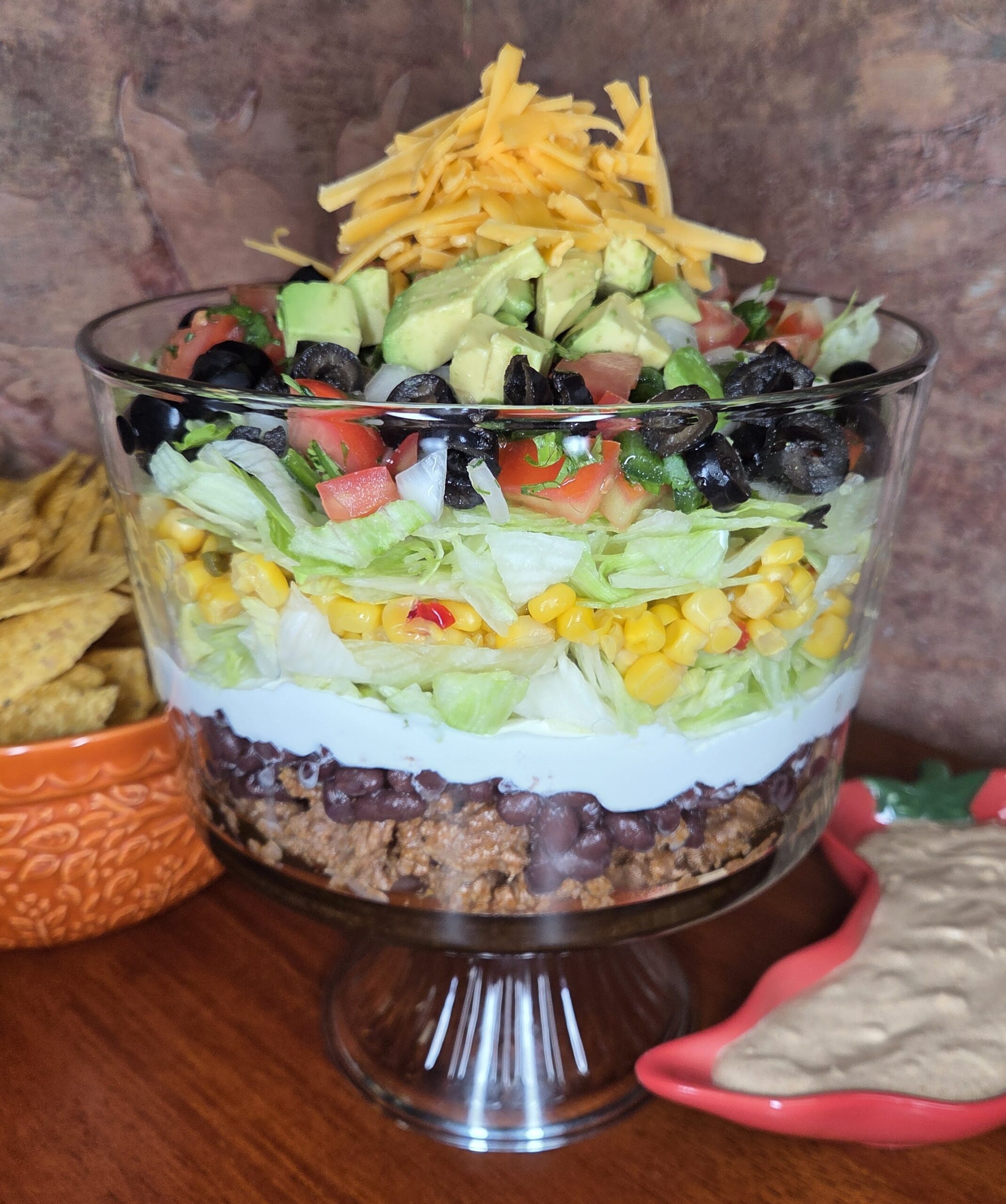 This delicious, layered taco salad is packed with bold Tex‑Mex flavor and served with a creamy taco‑style dressing. It’s vibrant, satisfying, and so quick and easy to assemble for any party, making it a guaranteed crowd‑pleaser with its fresh colors and irresistible layers of seasoned taco meat, black beans, sour cream, Mexican corn, lettuce, Pico de Gallo, avocado, and sharp cheddar cheese!