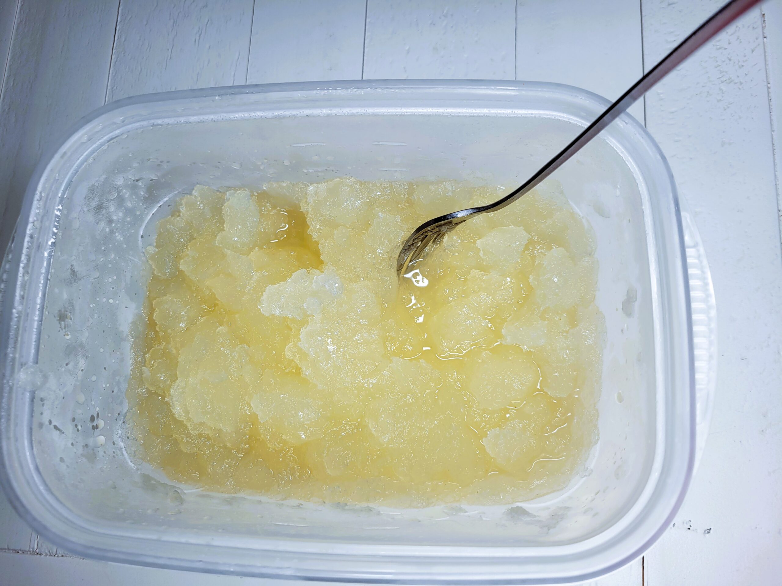 Every 30-45 minutes, take the container out of the freezer stirring and scraping the ice. Make sure that the ice is scraped away from the sides of the container.