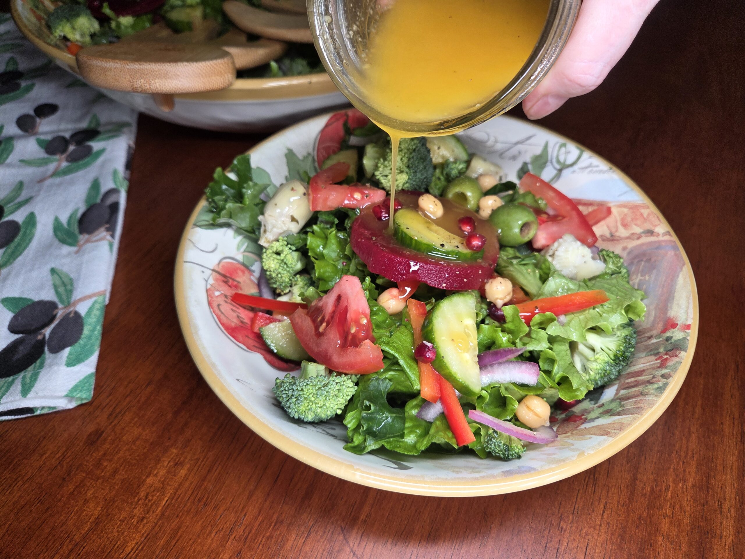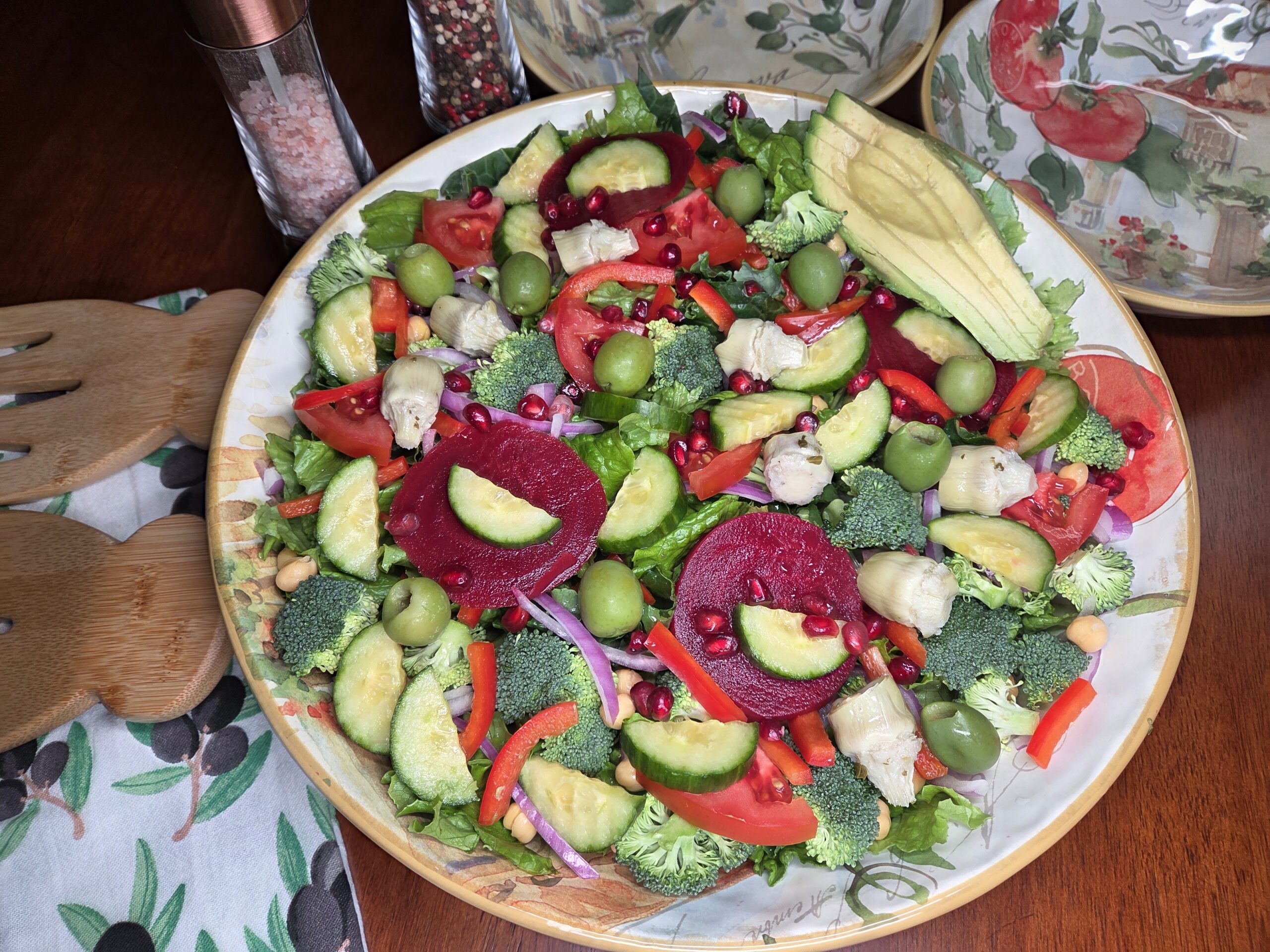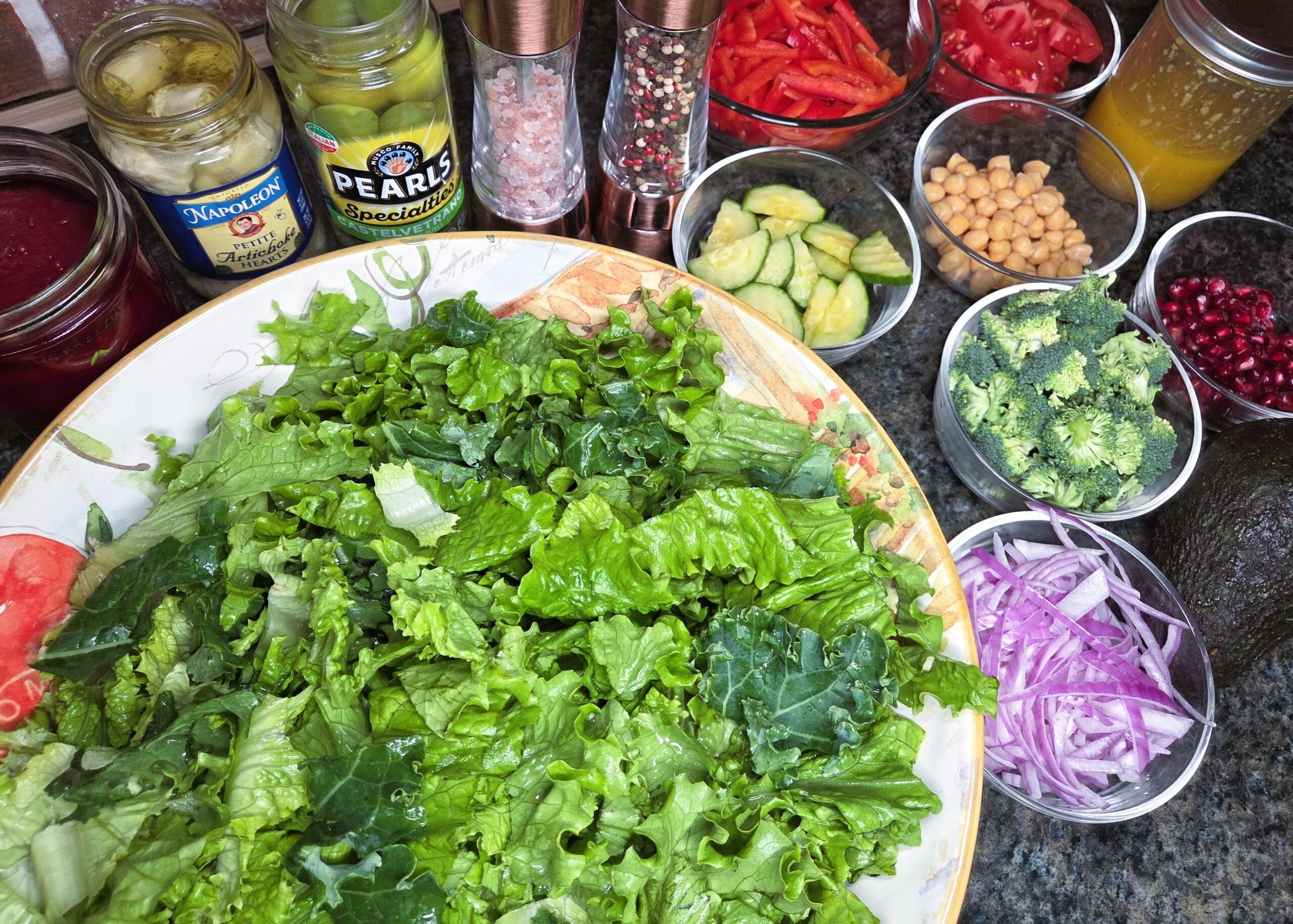 Wash and roughly chop 2 cups of kale and 1 head of romaine lettuce, then toss them into a large bowl as the base of the salad. Add 4–6 slices of pickled beets, or more if you like. We pickle our own beets from the garden each year, but canned beets from the store work fine too. Drain and rinse the chickpeas, setting them aside while you prep the veggies. Stem, seed, and thinly slice 1 red pepper, and thinly slice half of a red onion into half-moon slivers. Slice 2-3 medium tomatoes into slices, then quarters. Cut a small head of broccoli into bite‑sized florets, slice half a cucumber into small pieces, and layer everything neatly over the greens. Top it off with about 20 drained olives and some petite artichoke hearts for extra flavor and texture. Finally, sprinkle on half a cup of chickpeas and a third of a cup of pomegranate arils.