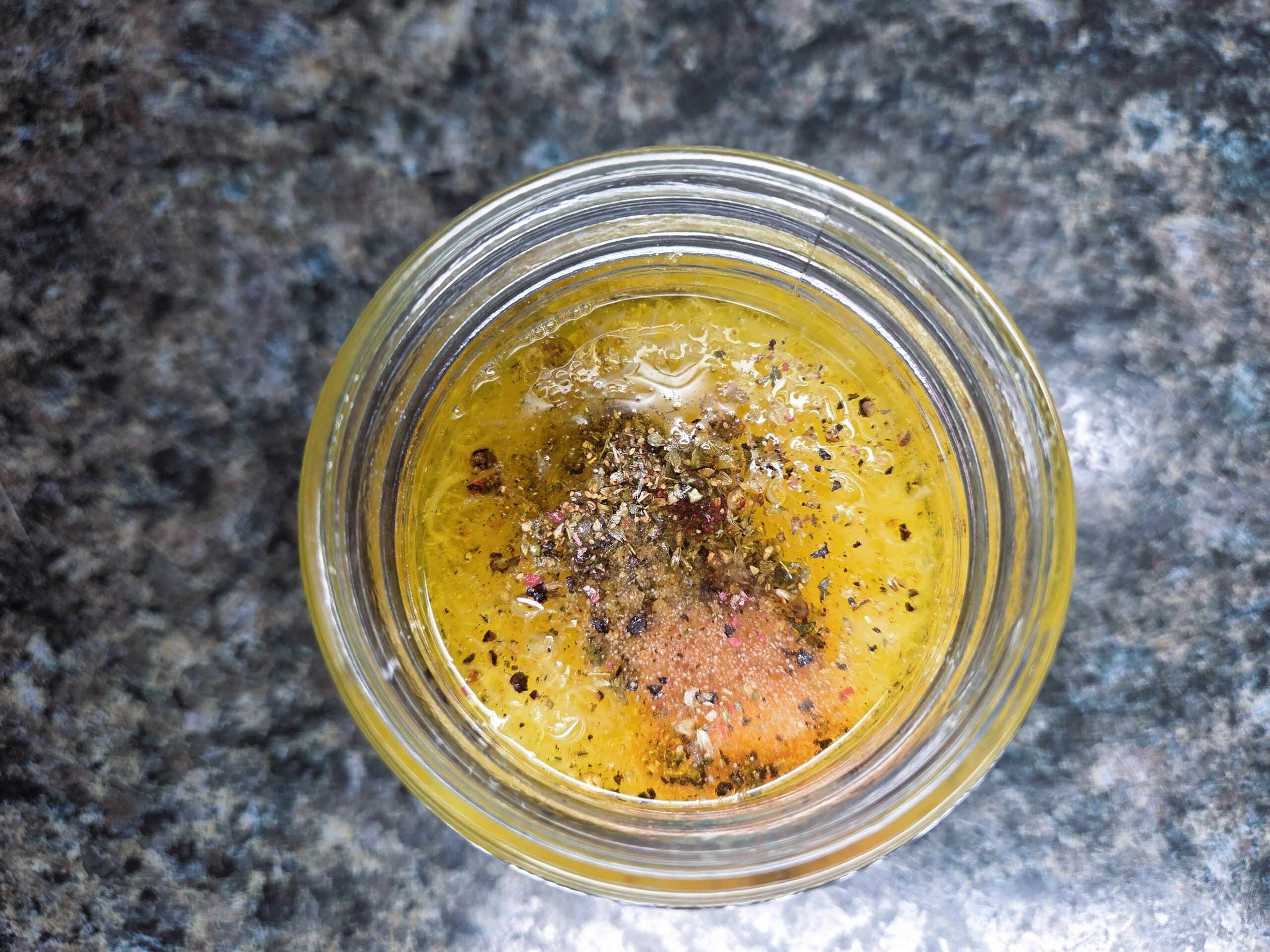 To make the salad dressing, add 1/3 cup olive oil, 1/4 cup fresh lemon juice, 3 tablespoons freshly grated Parmesan cheese, 1/4 teaspoon garlic powder, 1 tablespoon of honey if using, and 1/2 teaspoon oregano to a mason jar. Give it a good shake until smooth and slightly creamy. Season with salt and pepper to taste, adjust as needed, and drizzle over your salad just before serving.