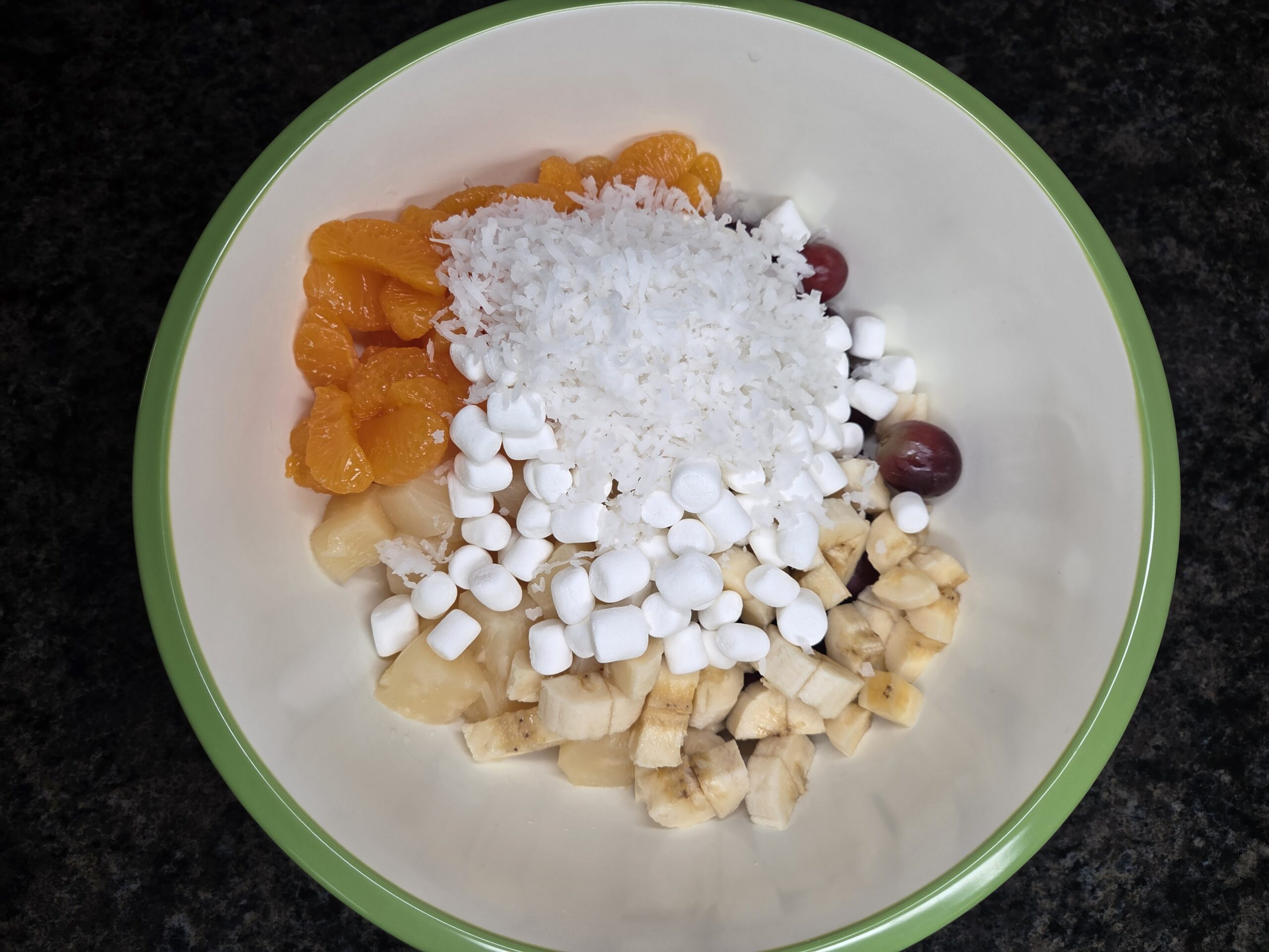 In a large bowl, combine the drained mandarin oranges, drained pineapple, chopped banana, grapes, marshmallows, toasted almonds, and coconut.