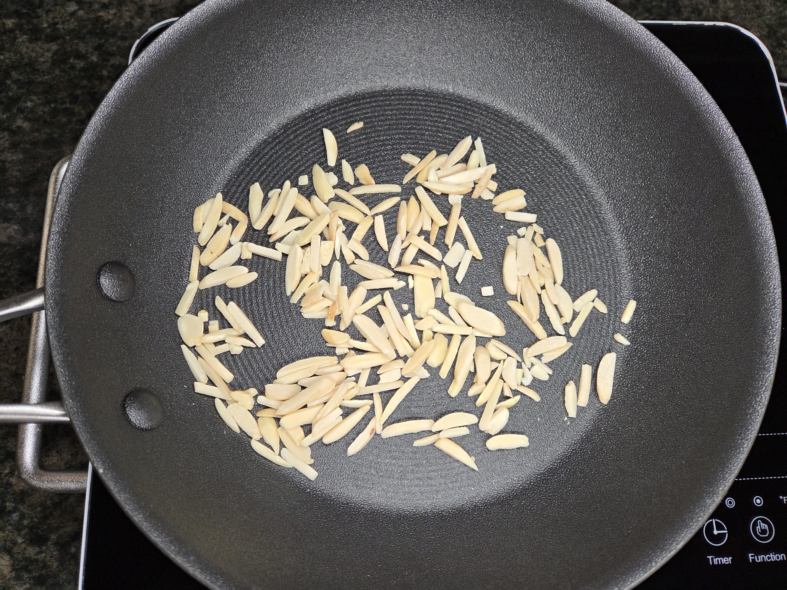 In a small dry pan over medium heat, toast ¼ cup of slivered almonds until lightly browned, about 4–5 minutes. Remove from the heat and allow them to cool completely.