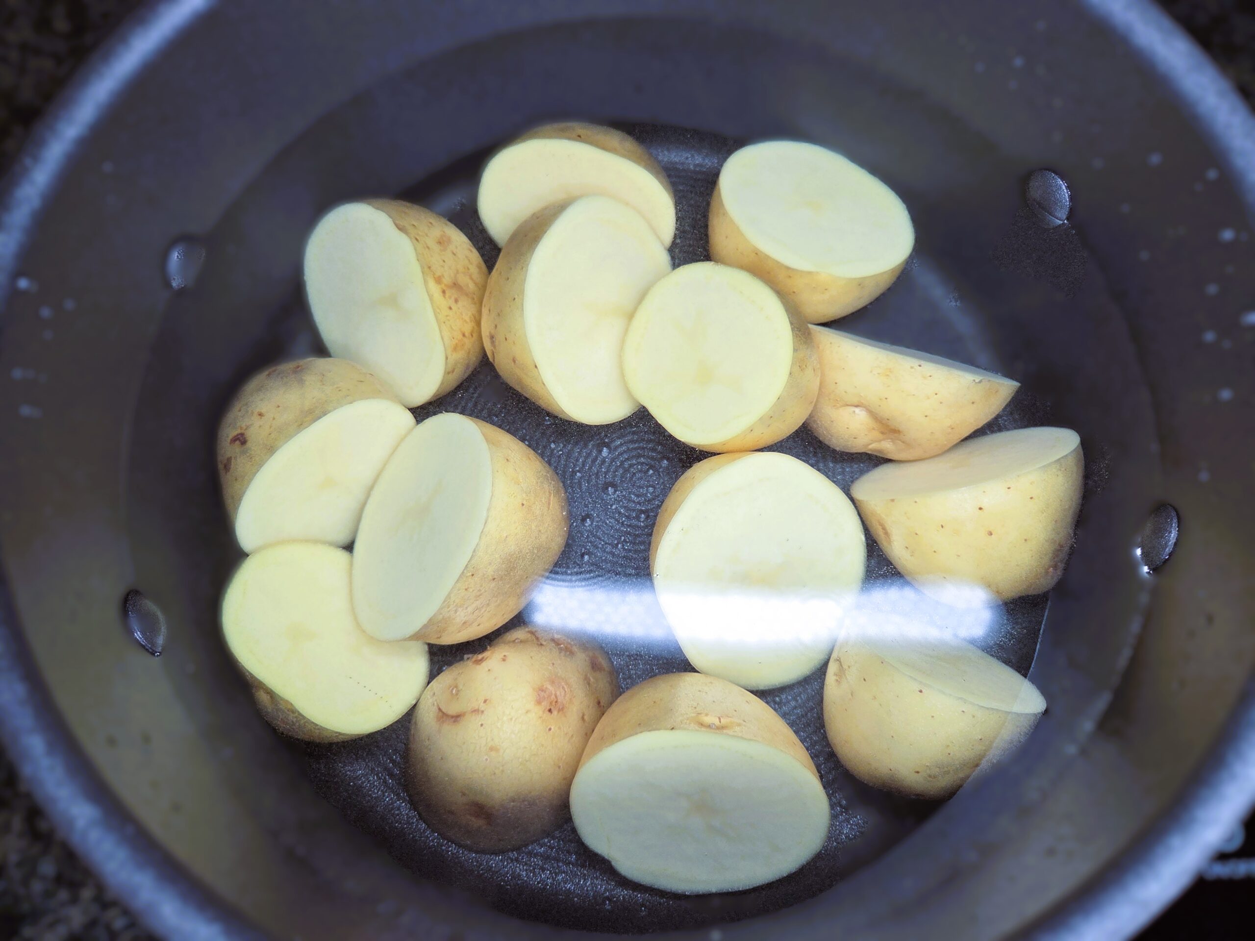 Wash the potatoes, cut them in half, and place them in a pot of salted water. Boil the potatoes just barely until fork-tender, then drain and set them aside to cool until they are easy to handle.