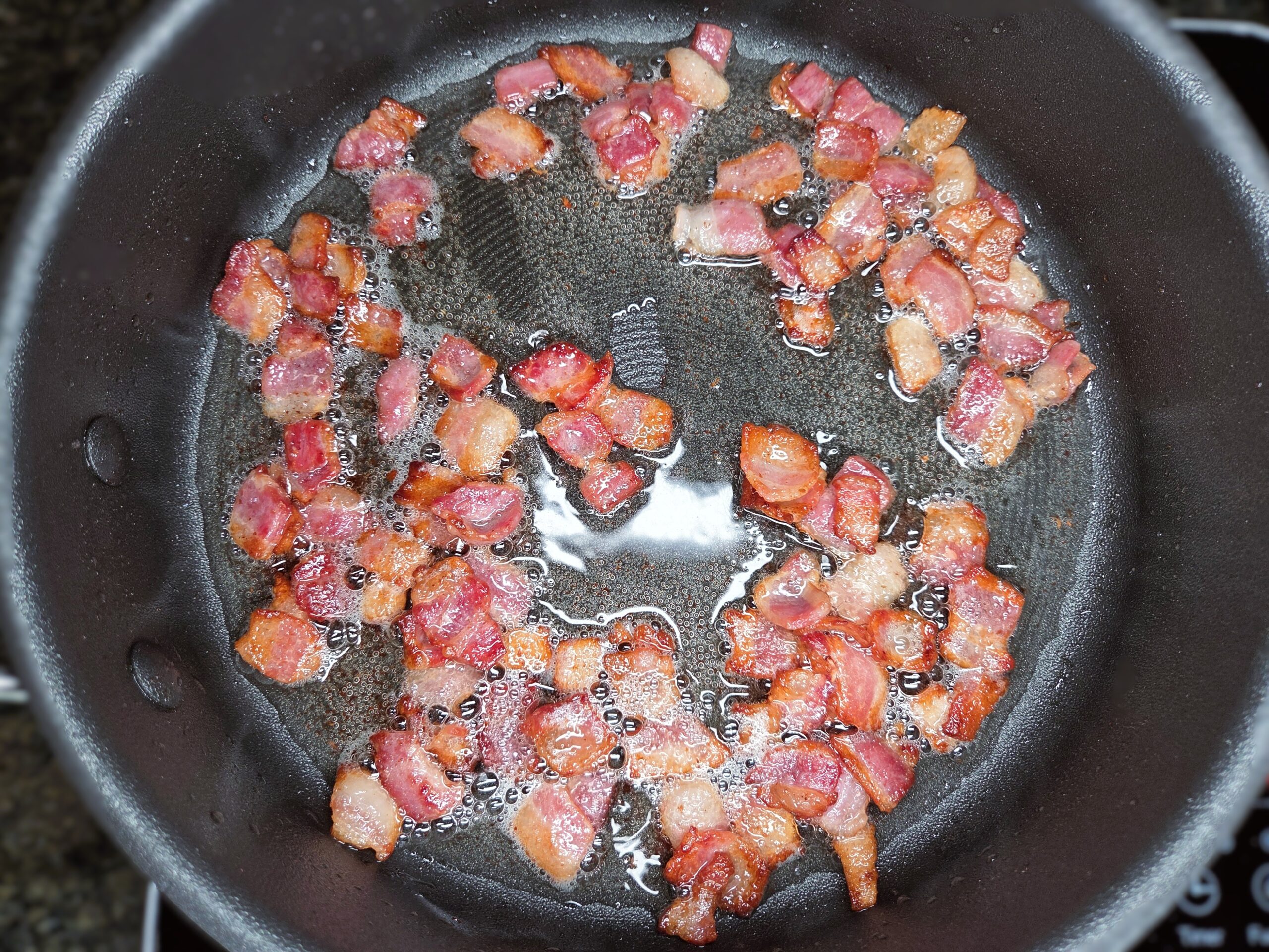 While the potatoes are boiling, chop the bacon and sauté it in a medium skillet on medium heat until golden brown. Then, using a slotted spoon, remove the bacon, leaving behind all of the drippings and grease. Place the bacon on a paper towel-lined plate.