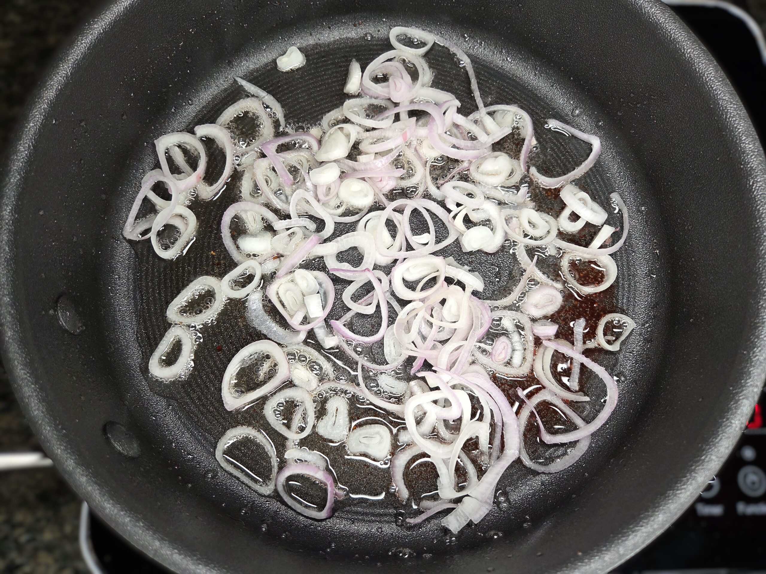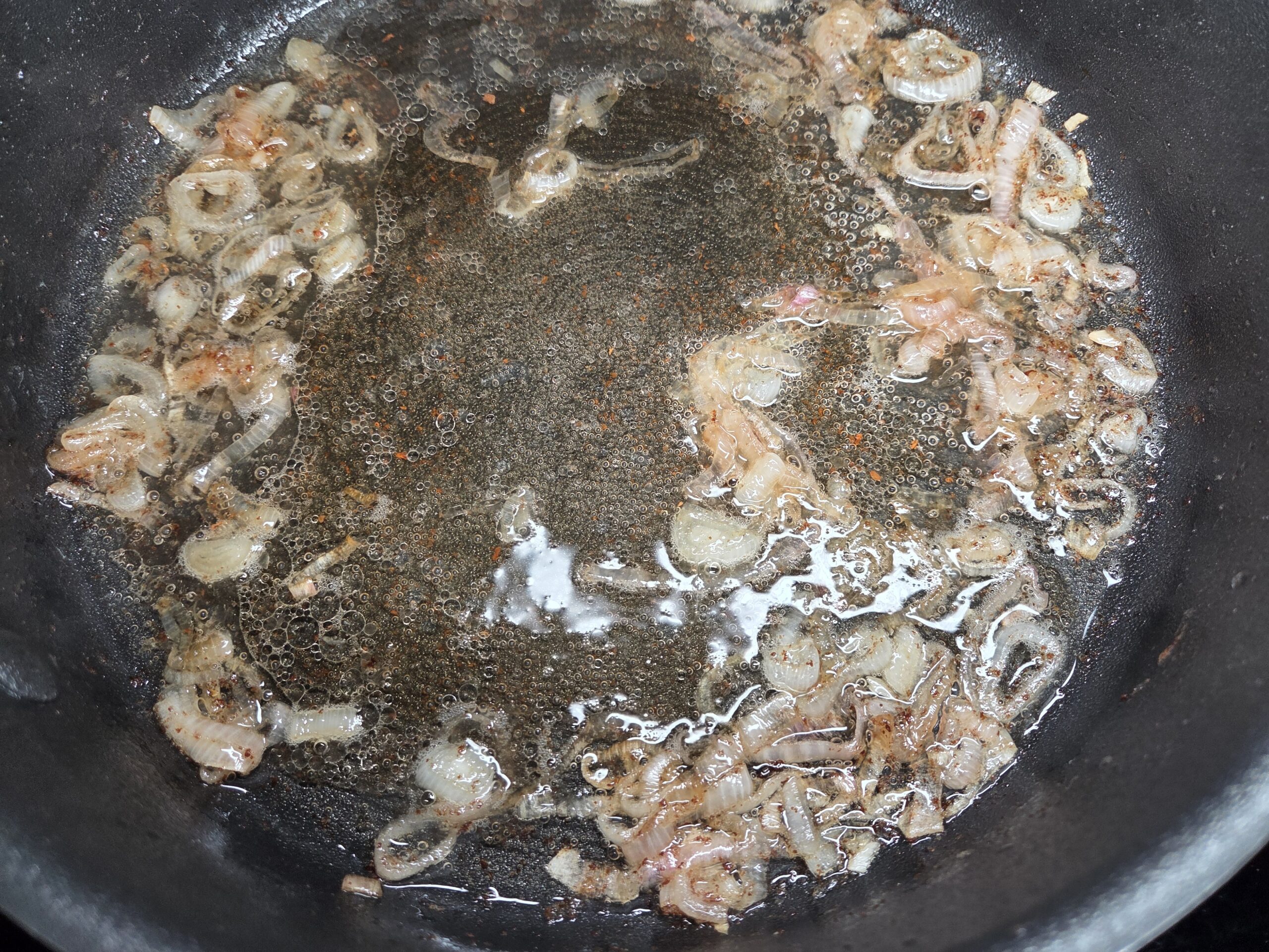 Add 2 thinly sliced shallots to the bacon drippings and sauté until the shallots are deeply caramelized, about 7-10 minutes.