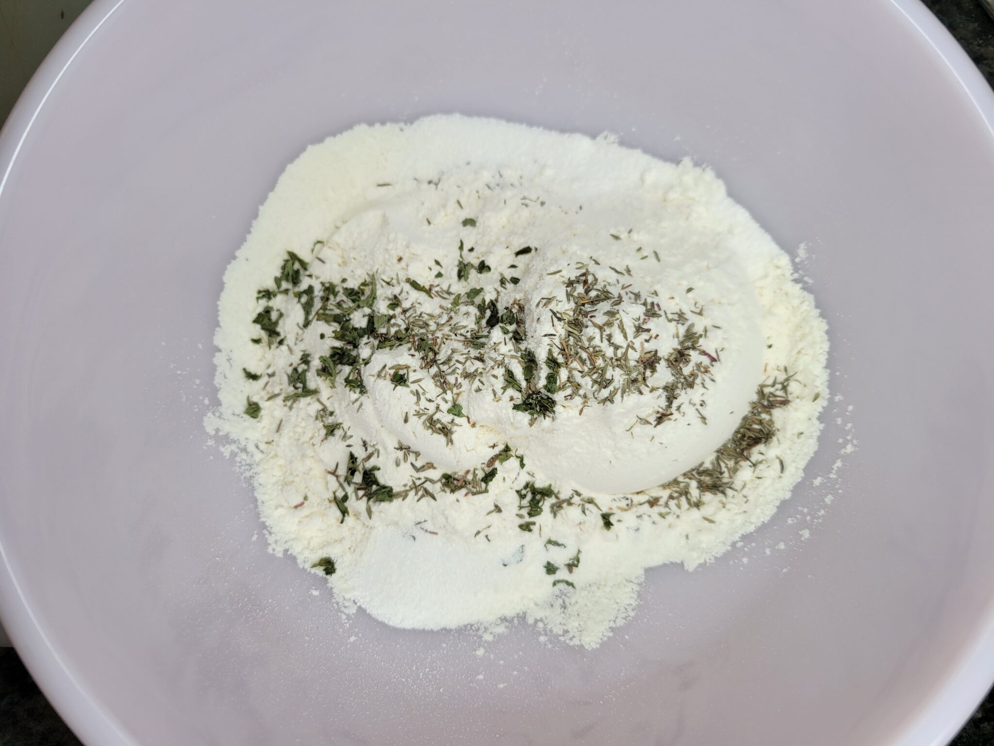 Make the dumplings. In a large bowl, combine 1¾ cups all‑purpose flour, 1 teaspoon salt, ⅛ teaspoon pepper, 2½ teaspoons baking powder, ½ teaspoon dried thyme, and ½ teaspoon dried parsley, and stir to blend.