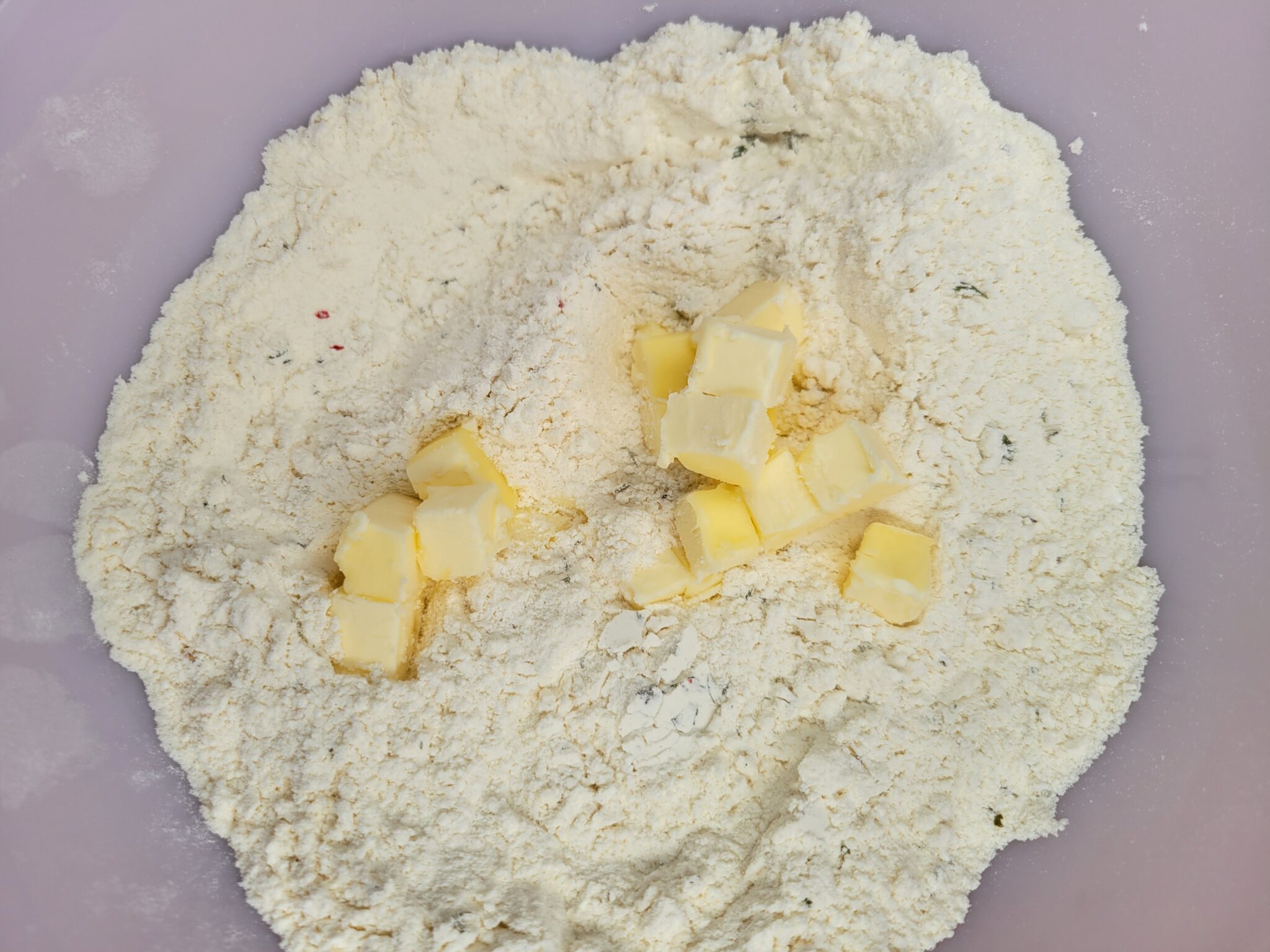 Add 4 tablespoons of cubed cold butter and cut it into the dry ingredients with a pastry cutter or a fork until the mixture resembles small pebbles.
