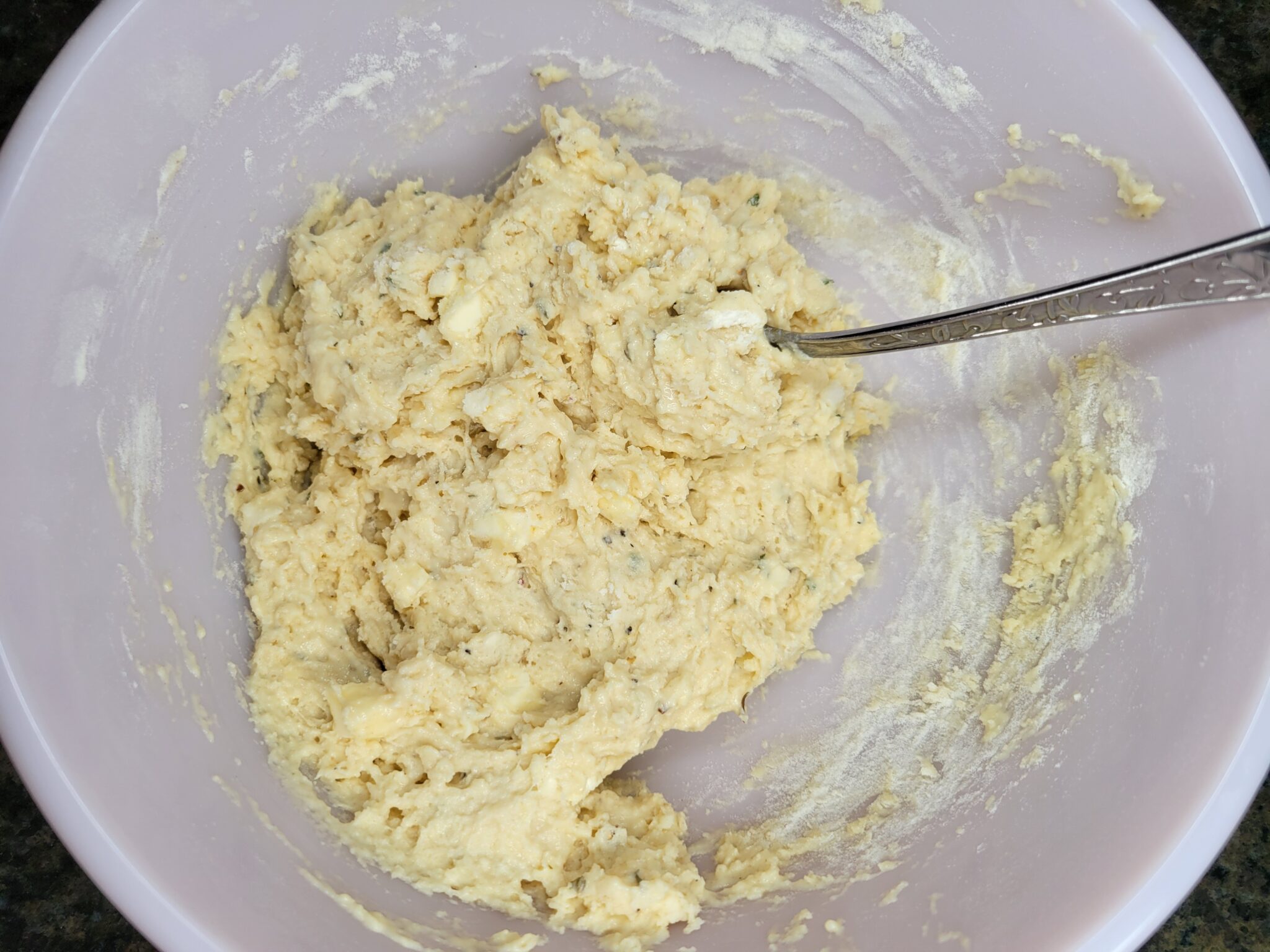 Add ¾ cup of milk and 1 beaten egg, stirring just until everything is combined.