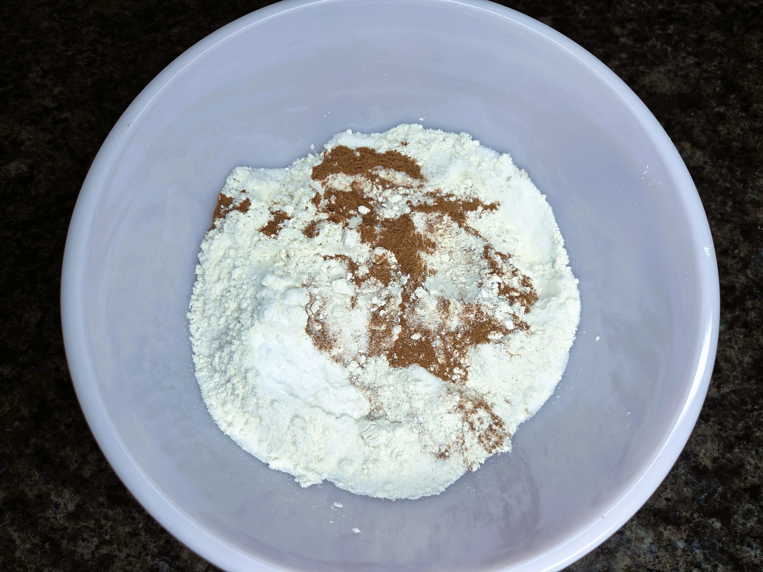 In a large mixing bowl, combine 1 1/2 cups of all-purpose flour, 3/4 cup of granulated sugar, 1/2 teaspoon of baking soda, 1/2 teaspoon of salt, and 2 teaspoons of pumpkin pie spice.