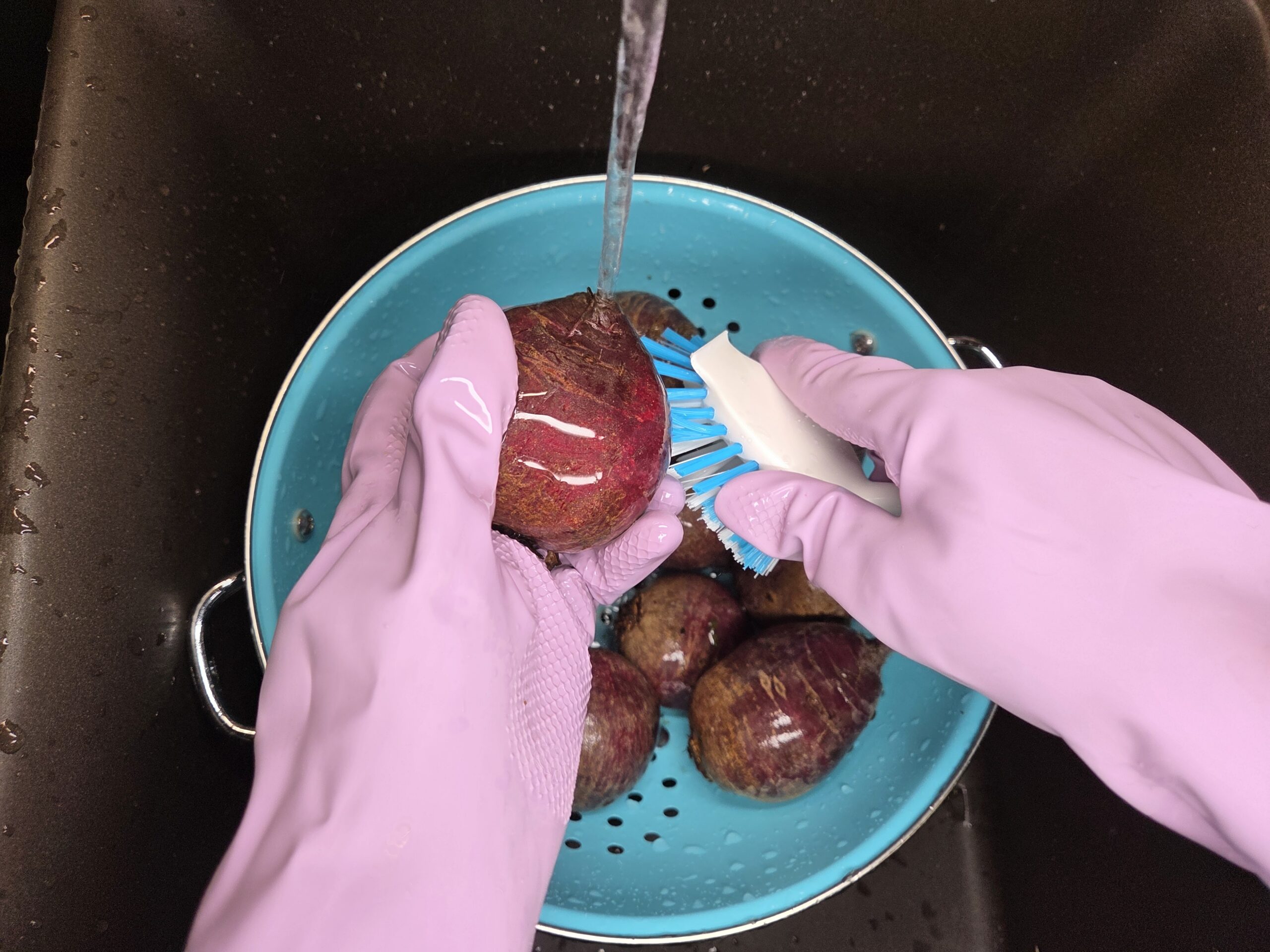 Trim the ends off the beets, leaving about 1 inch of stem attached to help prevent color loss, and scrub well to remove any dirt.