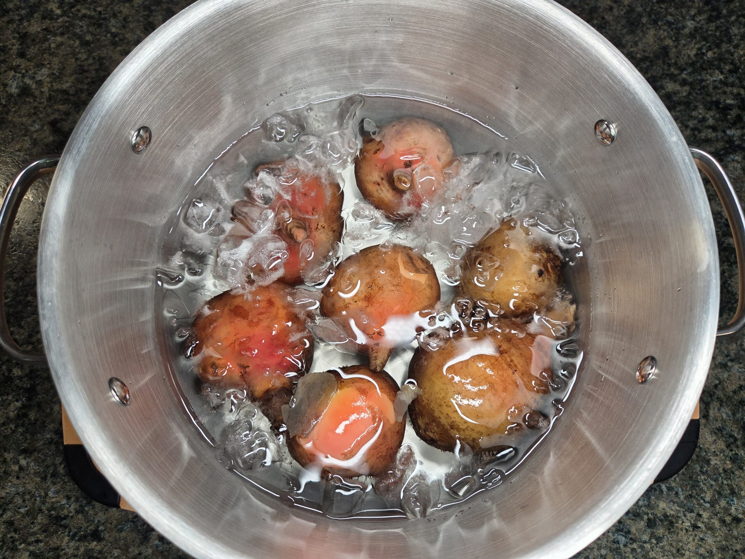 Remove them and immediately place them into an ice‑water bath to cool until they can be handled comfortably.