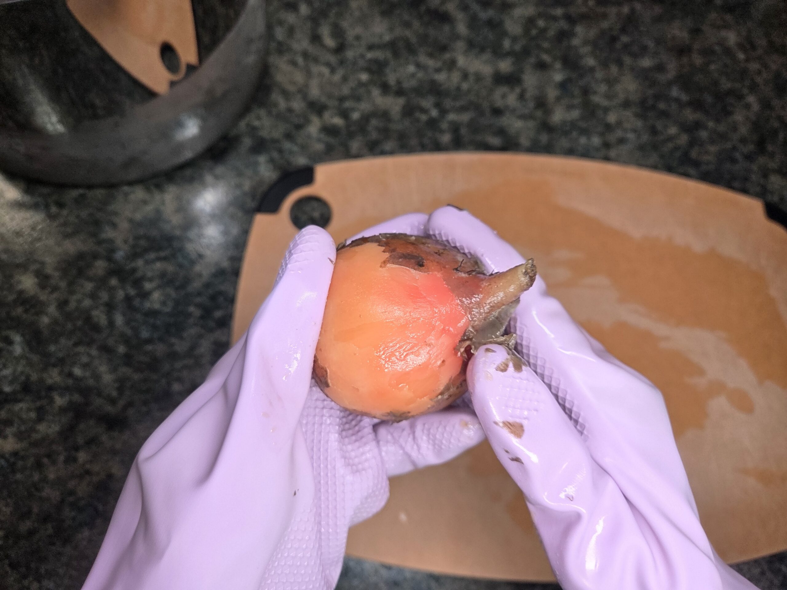 Once the beets are cool enough to handle, trim the ends and gently rub the skins off with your hands. Wearing gloves can help prevent stains. The skins should come off easily, but if any are stubborn, a potato peeler works well.