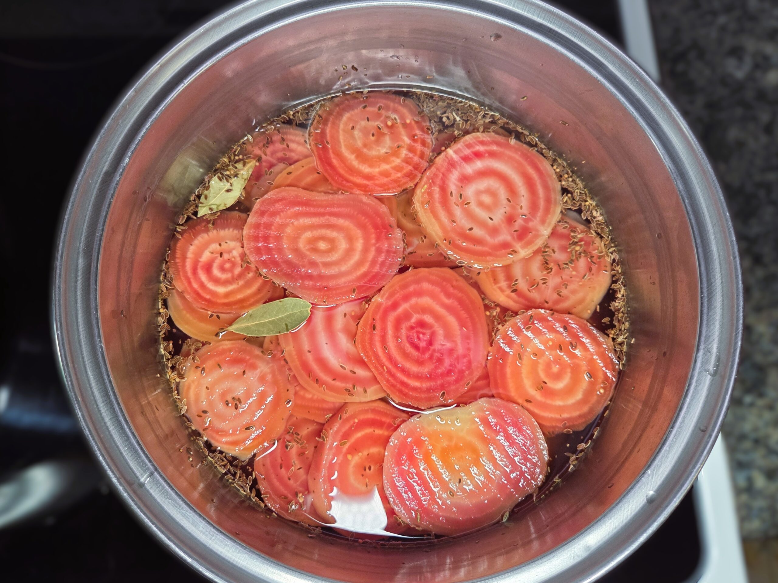 Add the sliced beets to the hot brine and heat them through, as they need to be hot when packed into jars. Remove and discard the bay leaves just before canning.