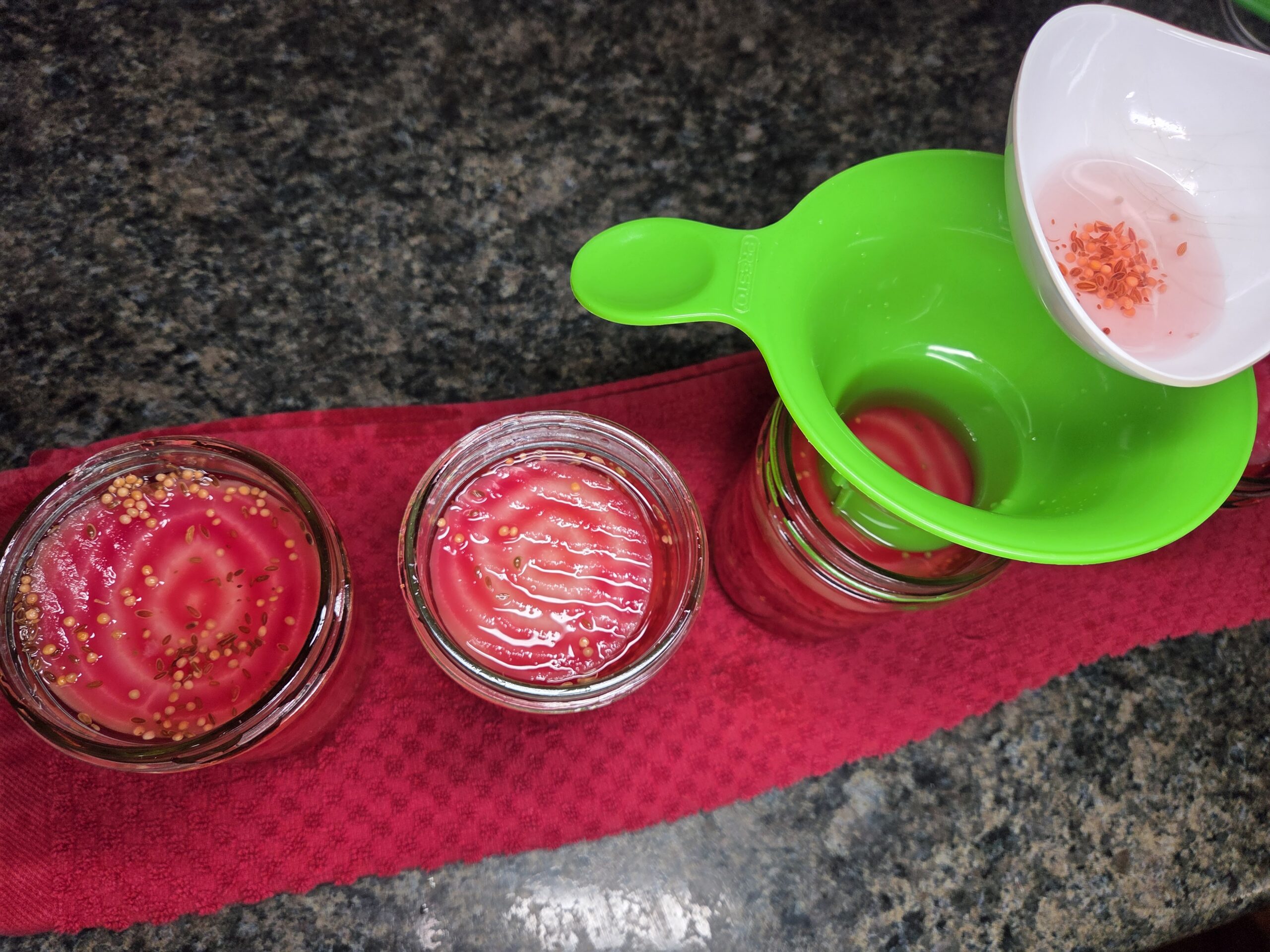 Place the beets into the hot jars, then pour the hot liquid over them, leaving 1/2 inch of space at the top. Use a non-reactive tool to release any trapped air bubbles or pockets.