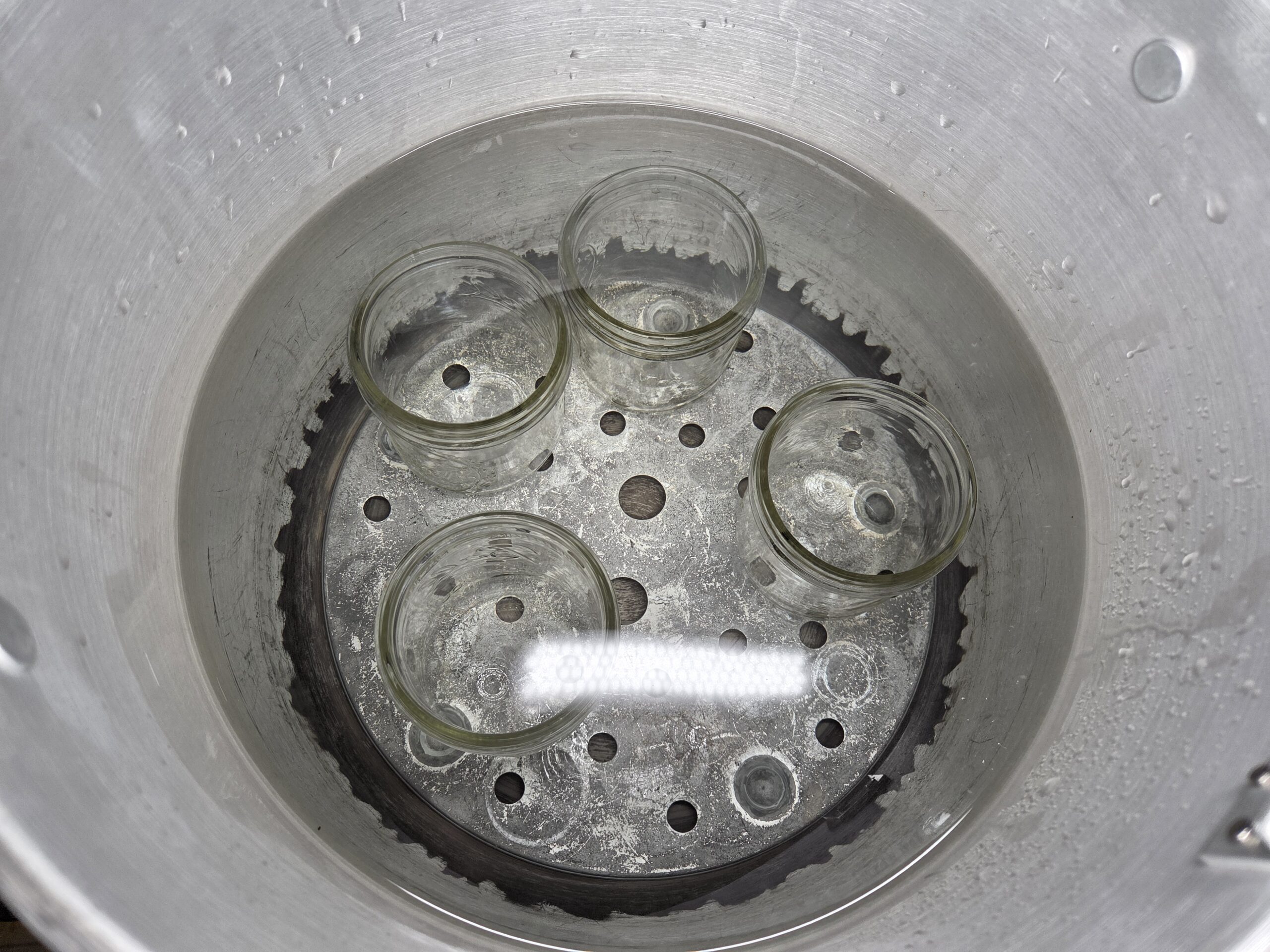 Carefully lower the jars into the boiling water, ensuring they remain upright. When using a jar lifter, make sure it is securely positioned below the neck of the jar (below the screw band of the lid). Keep the jar upright at all times. Tilting the jar could cause food to spill into the sealing area of the lid. Make sure the water covers the jars by 1–2 inches. Place the lid on the canner.