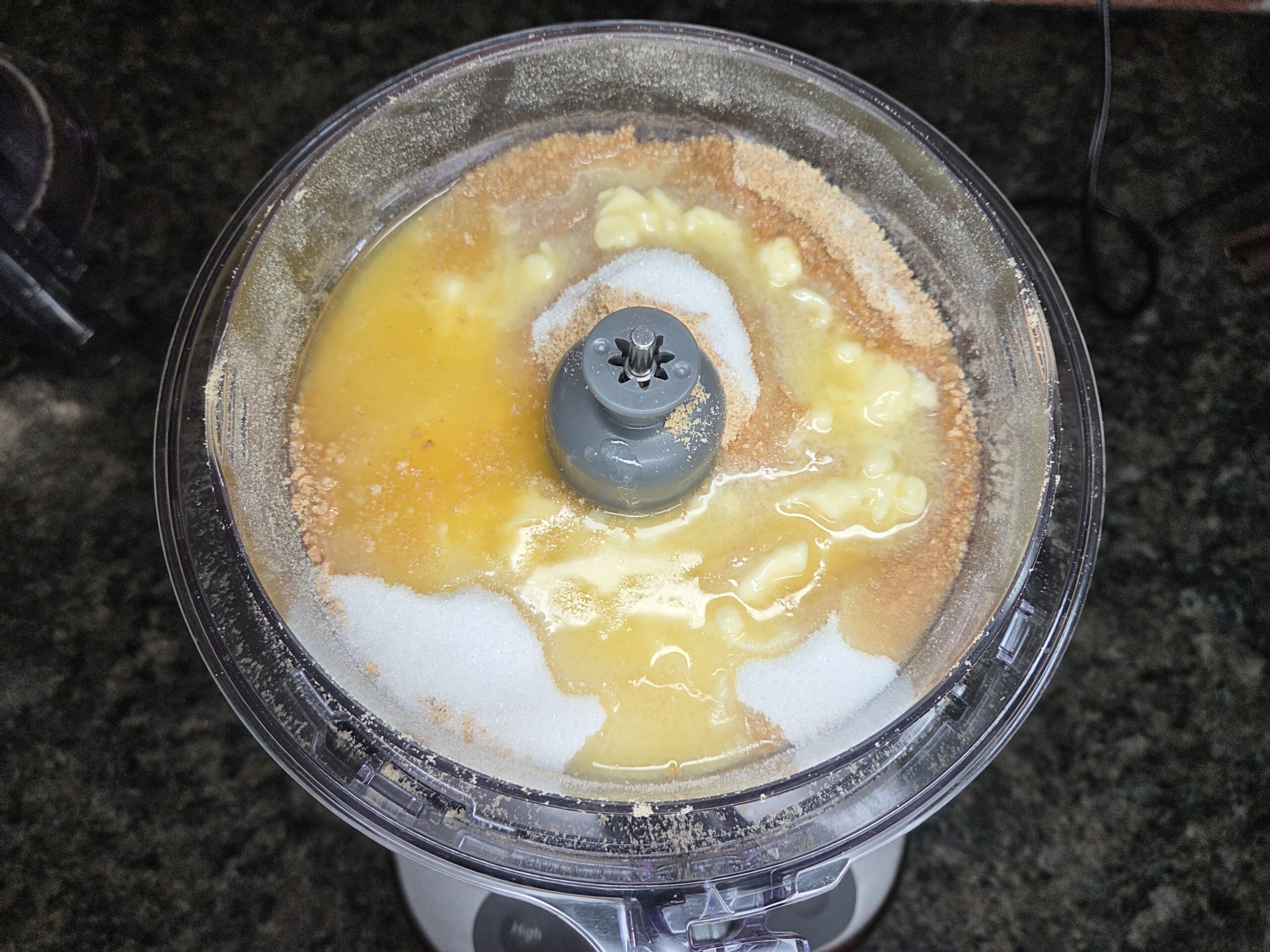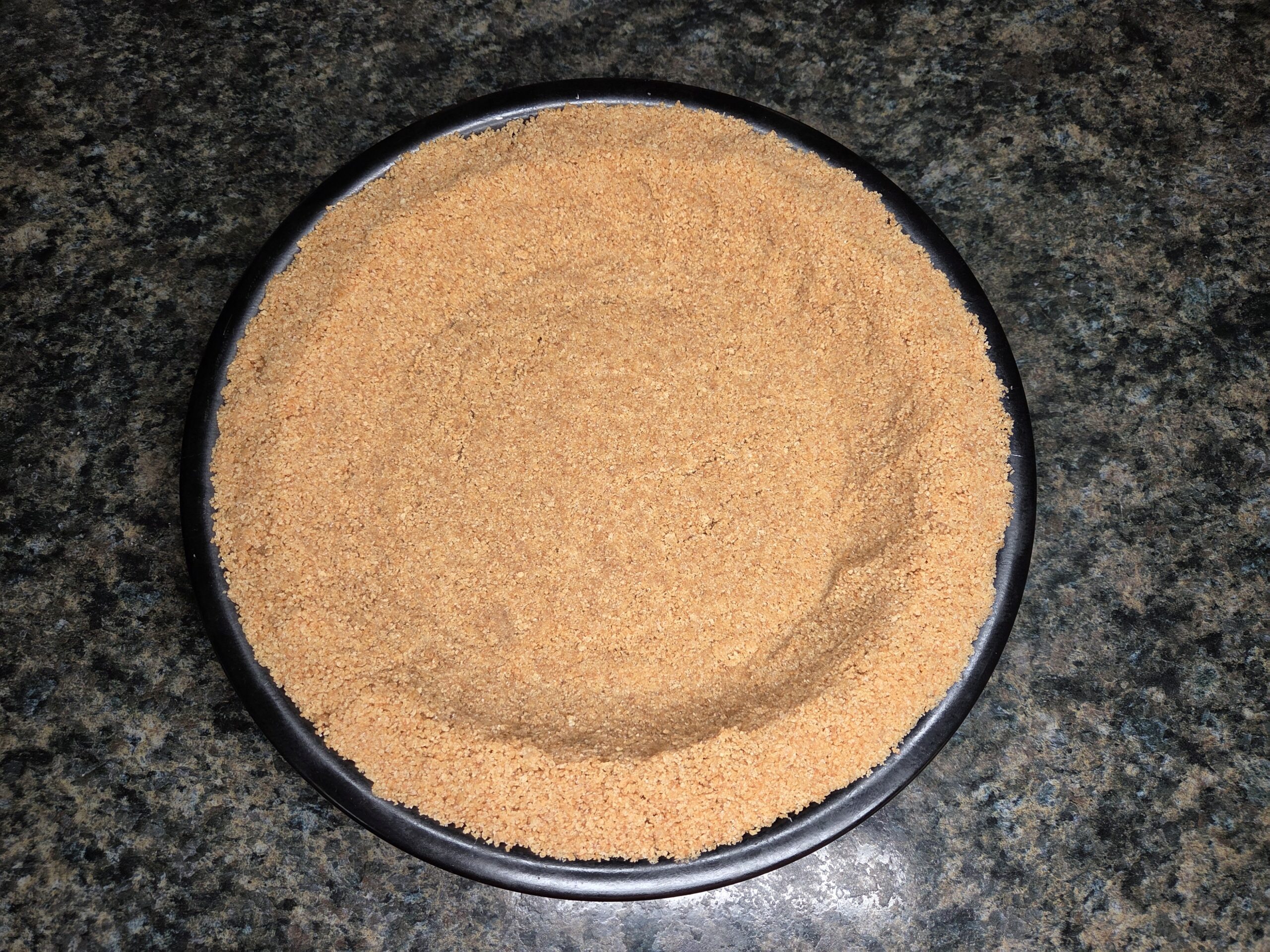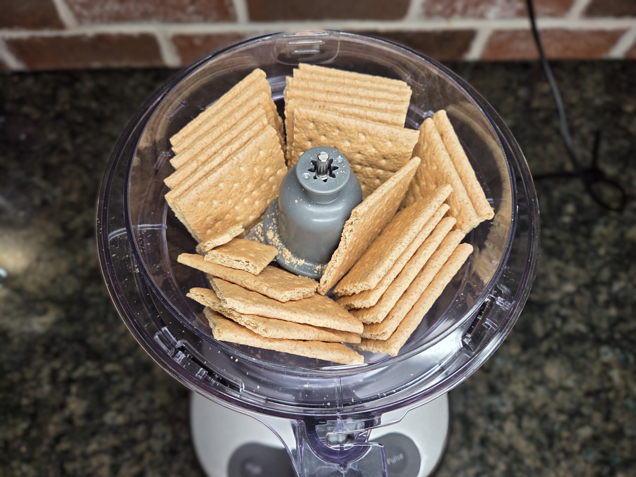 In a food processor, add about 16 full sheets of graham crackers and pulse until they form 2 cups of fine crumbs. Add 1/4 cup of granulated sugar and 1/2 cup of melted butter, then pulse again until the mixture is fully combined and resembles wet sand.