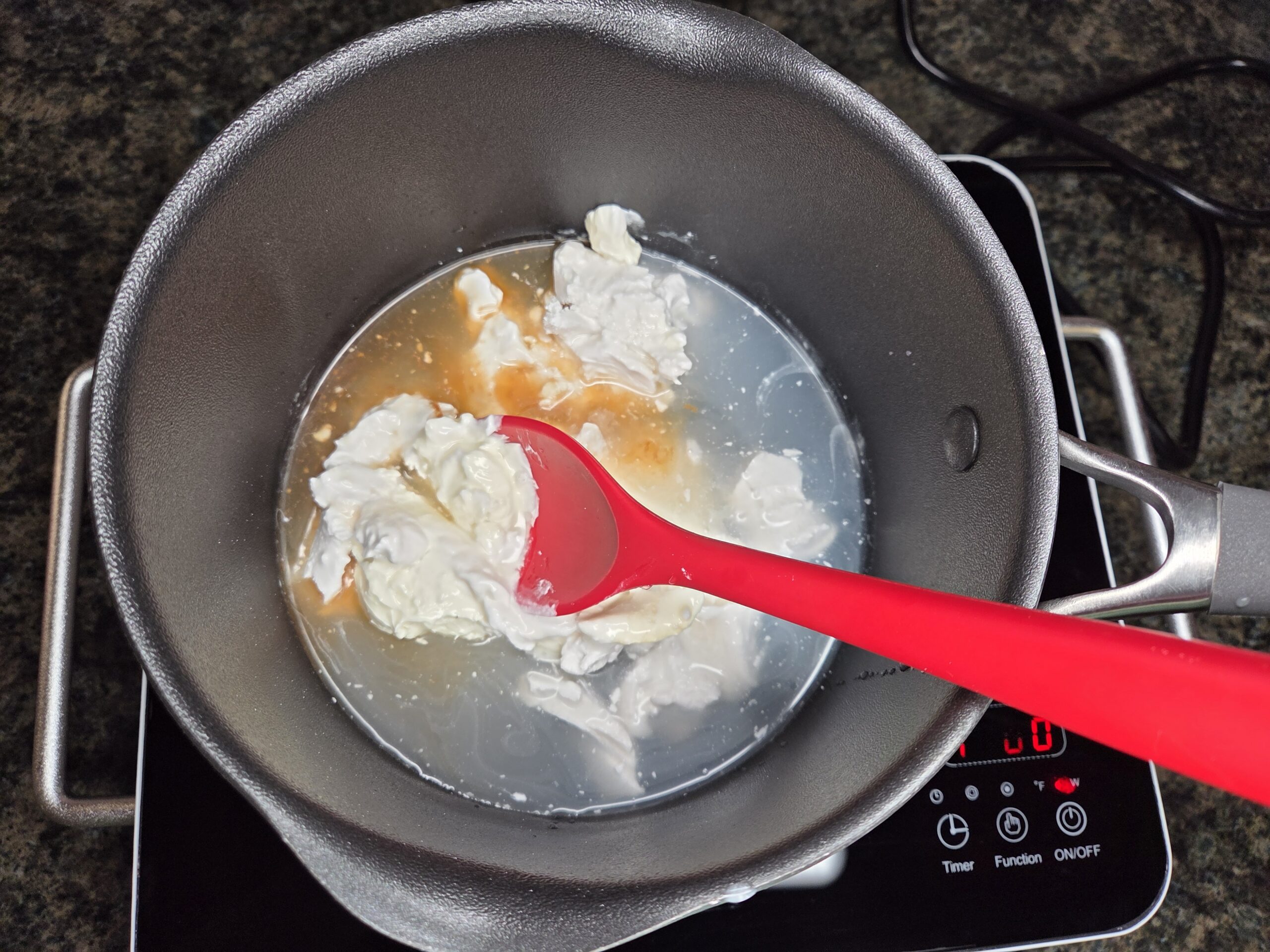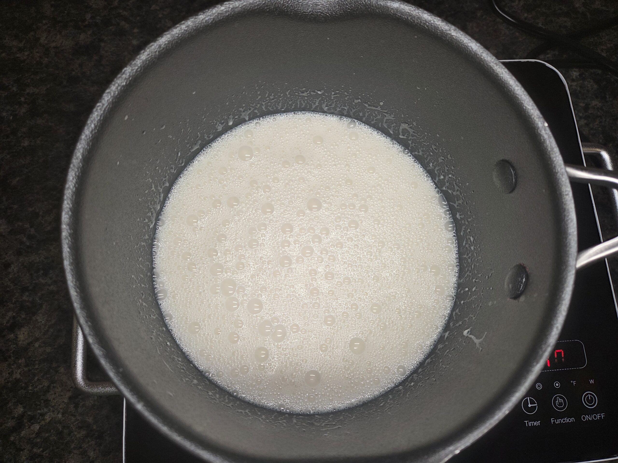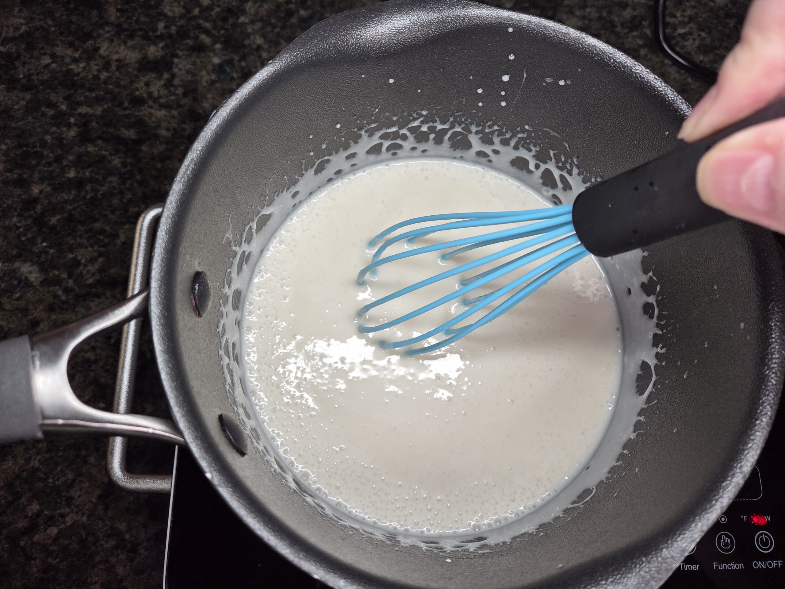 Pour the cornstarch slurry into the warm coconut mixture, stirring continuously until it thickens, turns creamy, and reaches a pudding-like consistency.