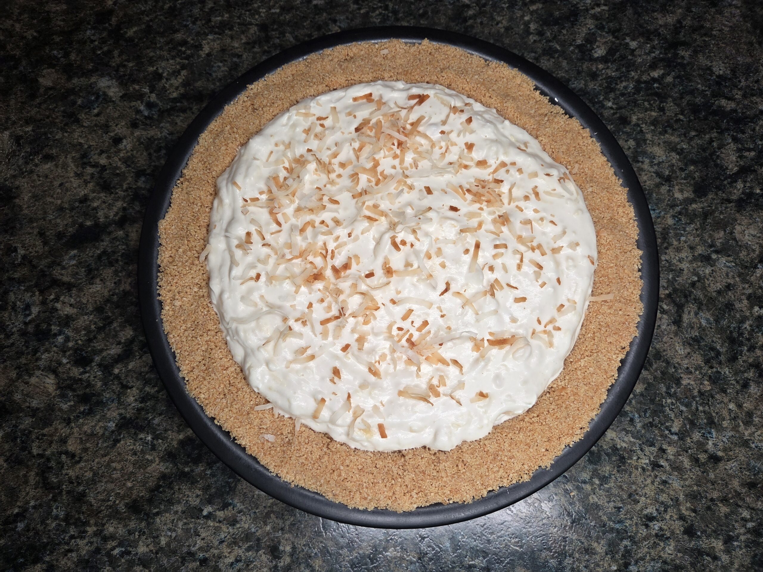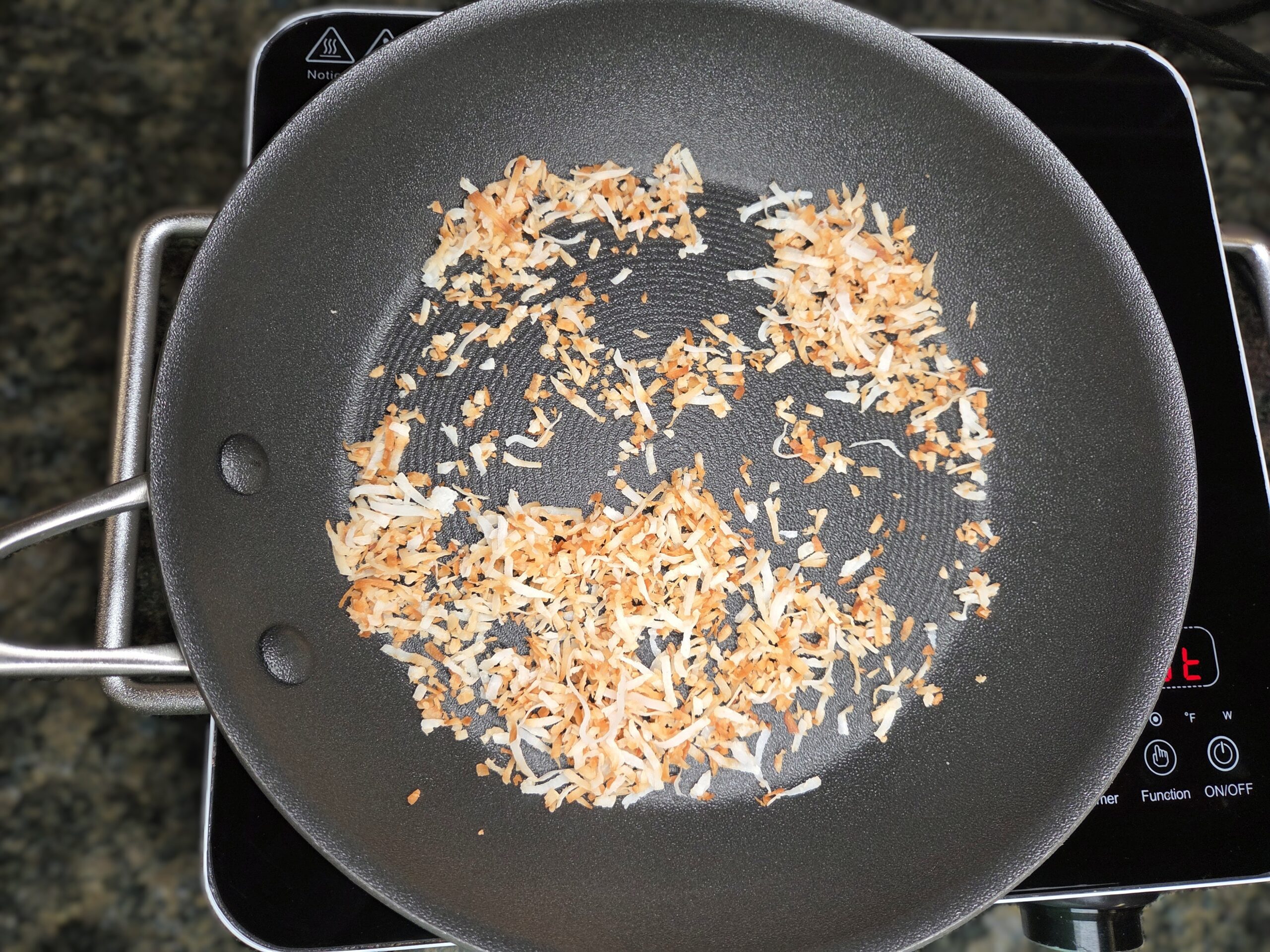 While the pie is chilling, toast the coconut for the topping. Add 1/4 cup of sweetened shredded coconut to a small dry skillet over medium heat and cook, stirring often, until it turns lightly golden brown and fragrant. Remove from heat and allow to completely cool before using.