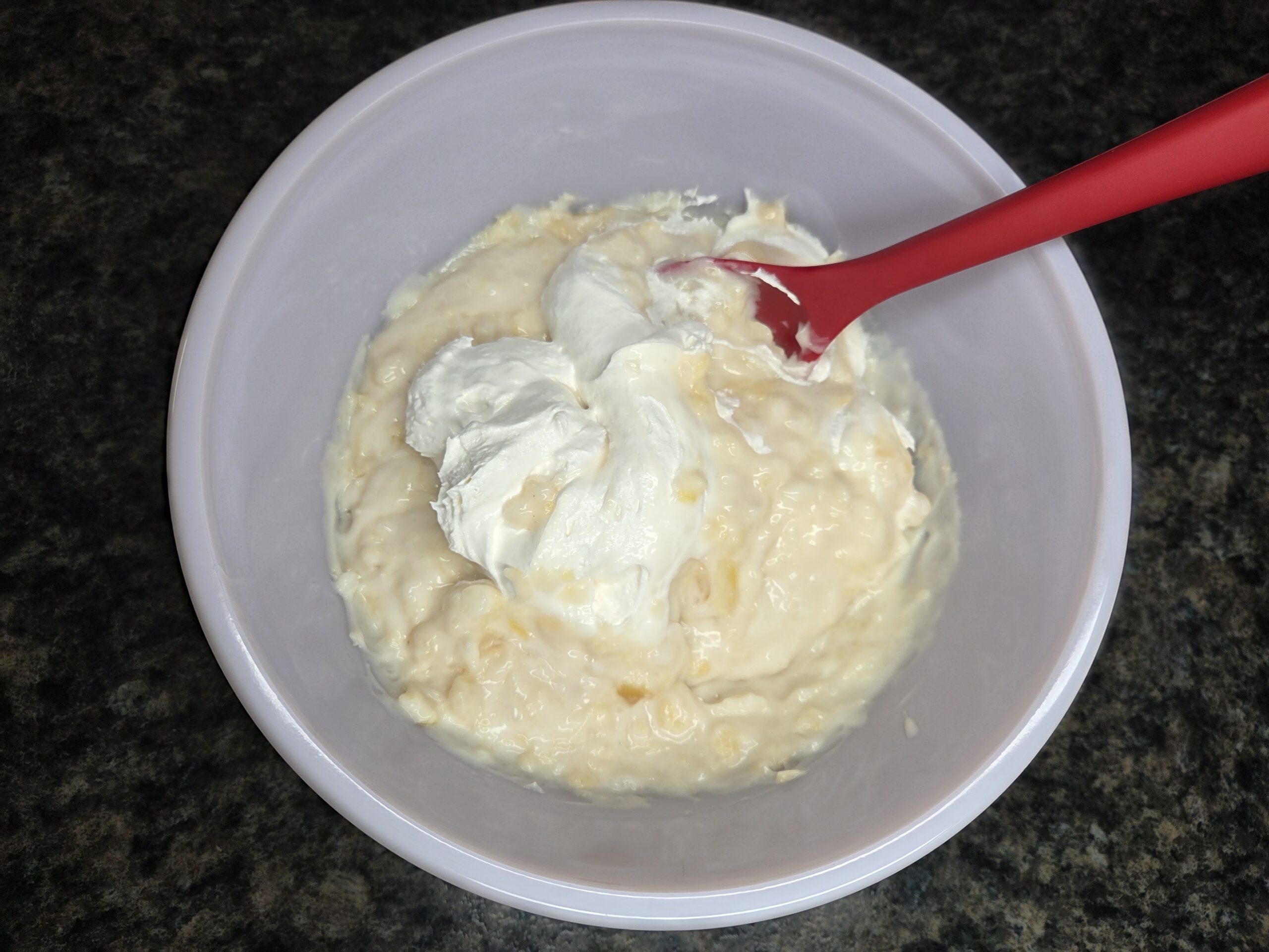 Once the filling is fully chilled, gently fold in 1 cup of whipped cream or whipped topping until the mixture is light, fluffy, and evenly combined.