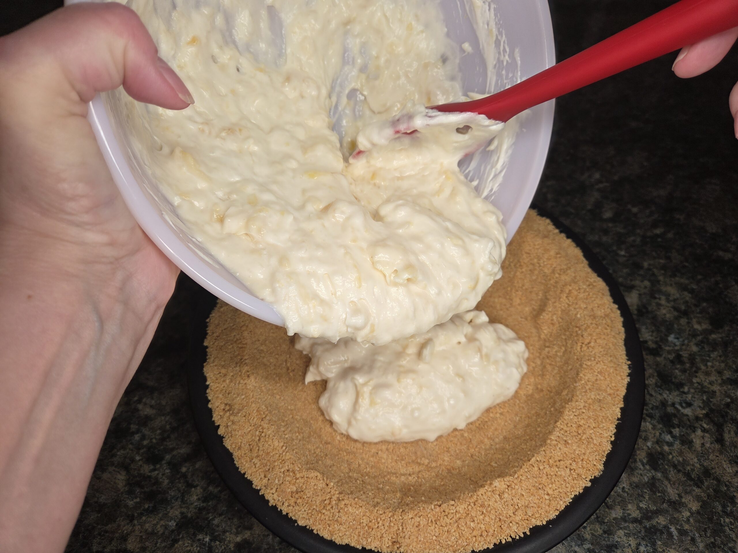 Pour the graham cracker mixture into a 9‑inch pie plate and press it firmly into the bottom and up the sides, using the flat bottom of a drinking glass to create an even, compact crust. Chill the crust in the refrigerator for 30–40 minutes to help it set.