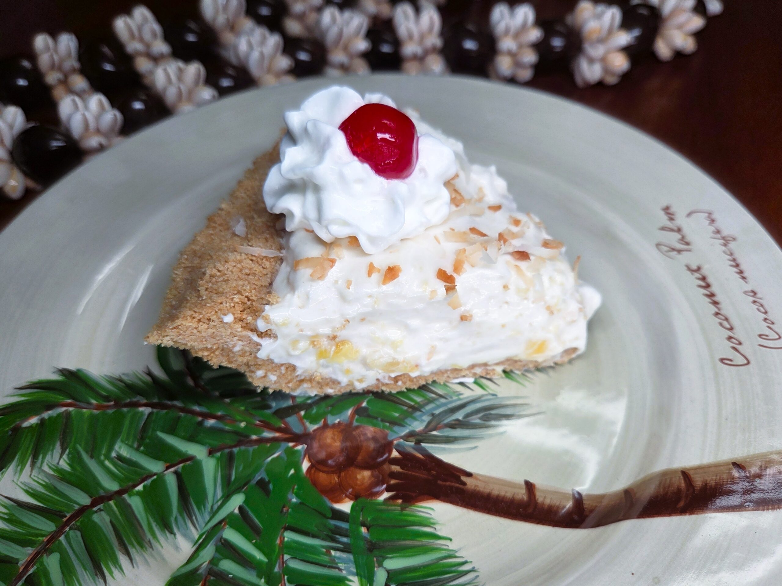 Once both the pie and the toasted coconut are completely cool, sprinkle the coconut evenly over the top. Slice and serve with a dollop or swirl of whipped topping and a maraschino cherry for the perfect Piña Colada finish.