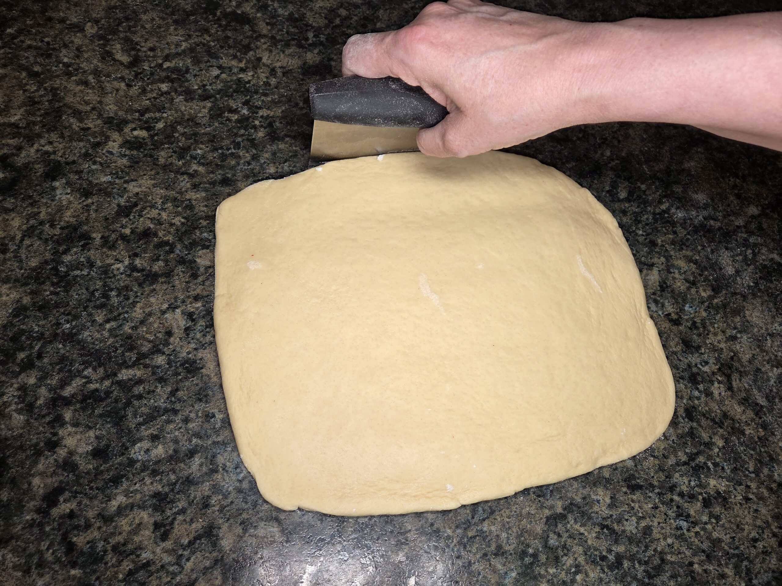 Lightly dust your work surface with flour to prevent sticking, then place the risen dough onto it. Using a rolling pin, gently roll the dough into a rectangle measuring about 10 by 12 inches, keeping the thickness around half an inch.