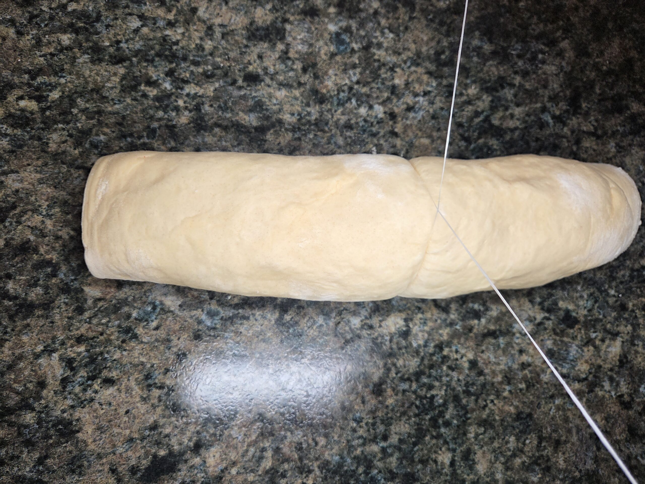 Using a piece of unflavored dental floss, gently slide it underneath the rolled dough until you reach the center. Cross the ends of the floss over the top and pull them in opposite directions to slice cleanly through the dough. This method prevents the spiral from being squashed, giving you neat, even cuts without compressing the layers. After cutting the log in half, continue using the floss to divide each section into smaller rolls of equal size, ensuring uniform baking and beautiful swirls in every piece. You should end up with 8 rolls.