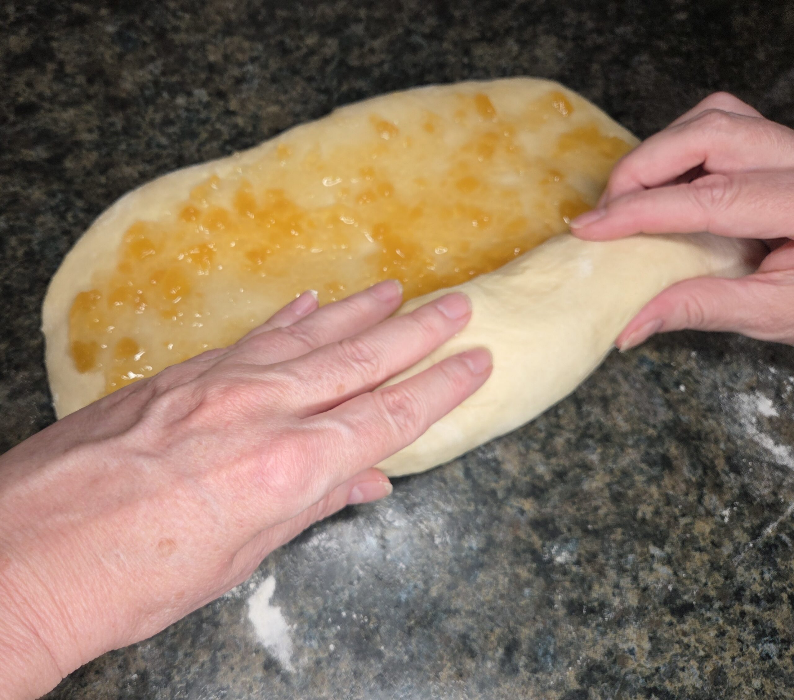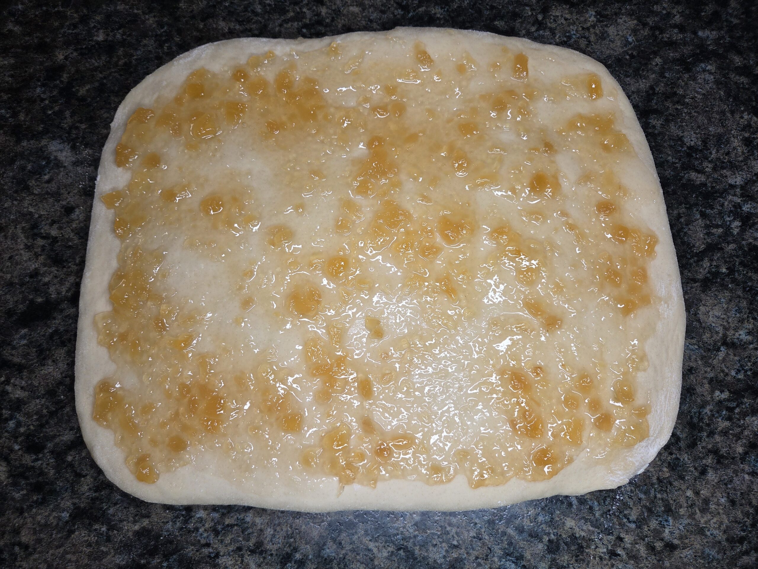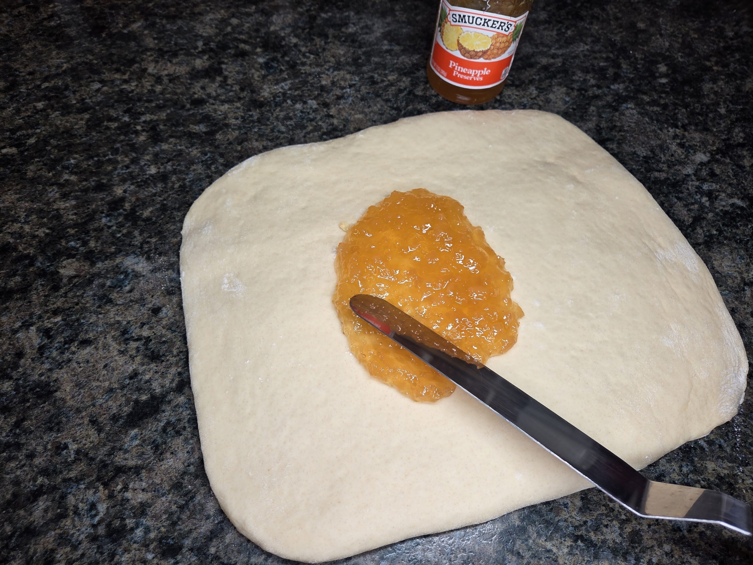 Spread 1/2 cup of pineapple preserves evenly over the rolledāout dough, going all the way to the edges but leaving a small border so it doesnāt spill out as you roll.