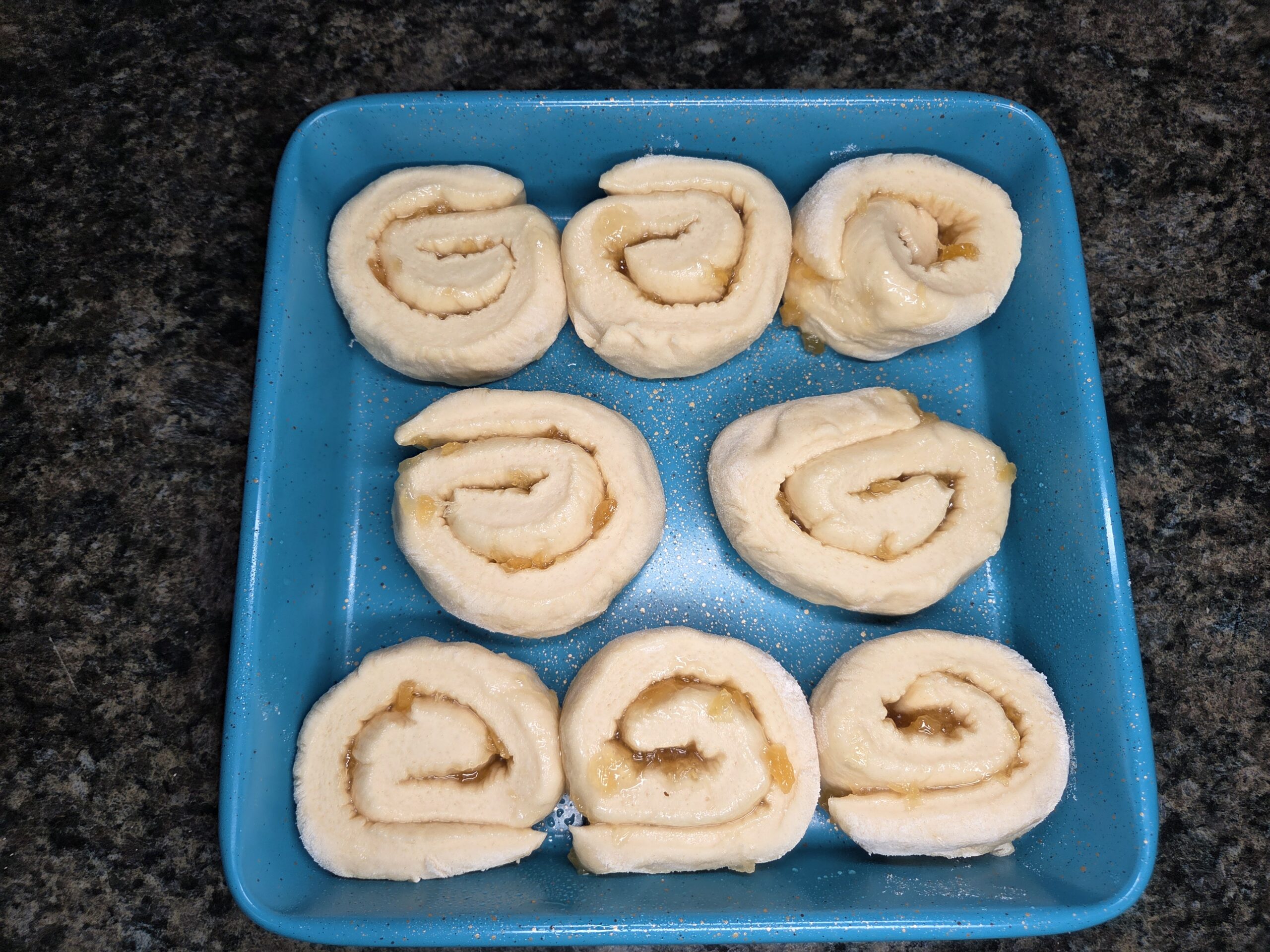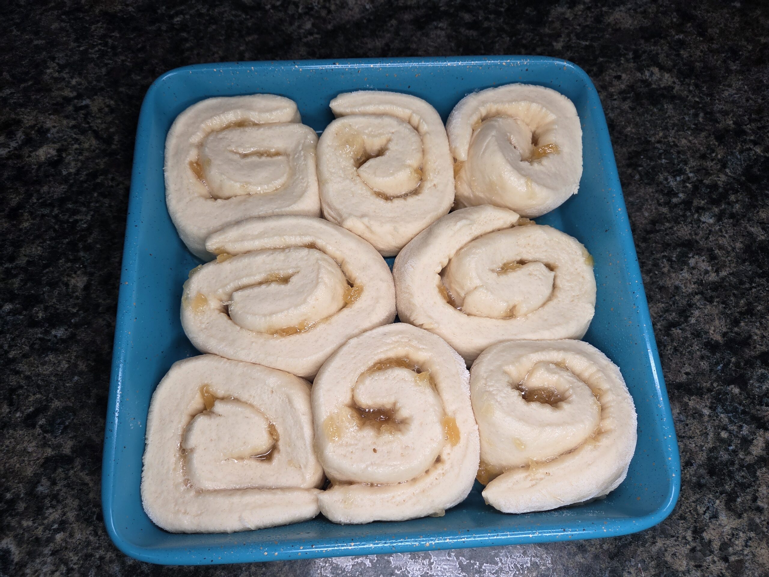Spray a 9Ć9 square or round baking pan with nonstick spray, then place all 8 Pina Colada rolls inside, leaving just a little space between each one so they can expand. Cover the pan with plastic wrap and let the rolls rise in a warm spot for 30ā60 minutes.