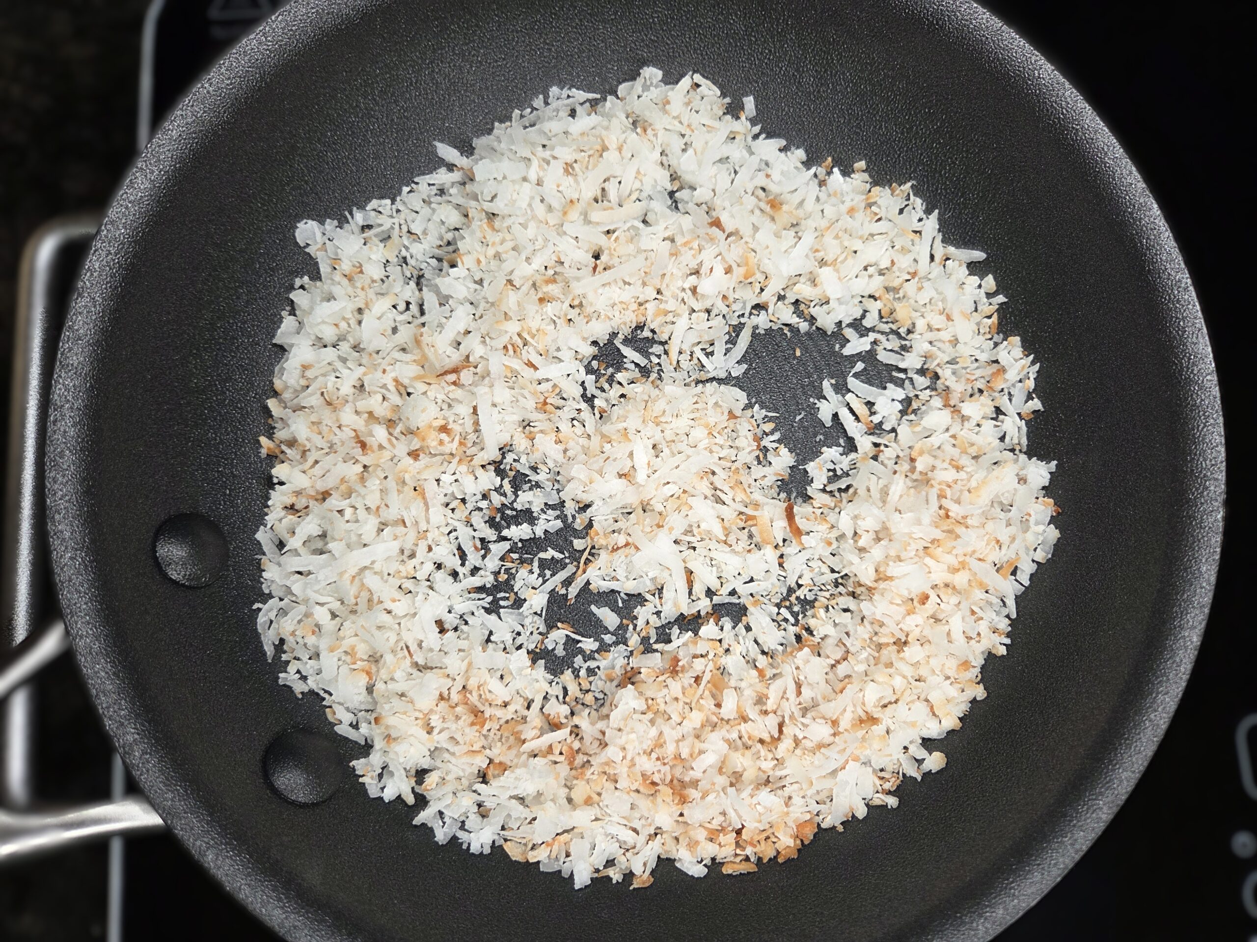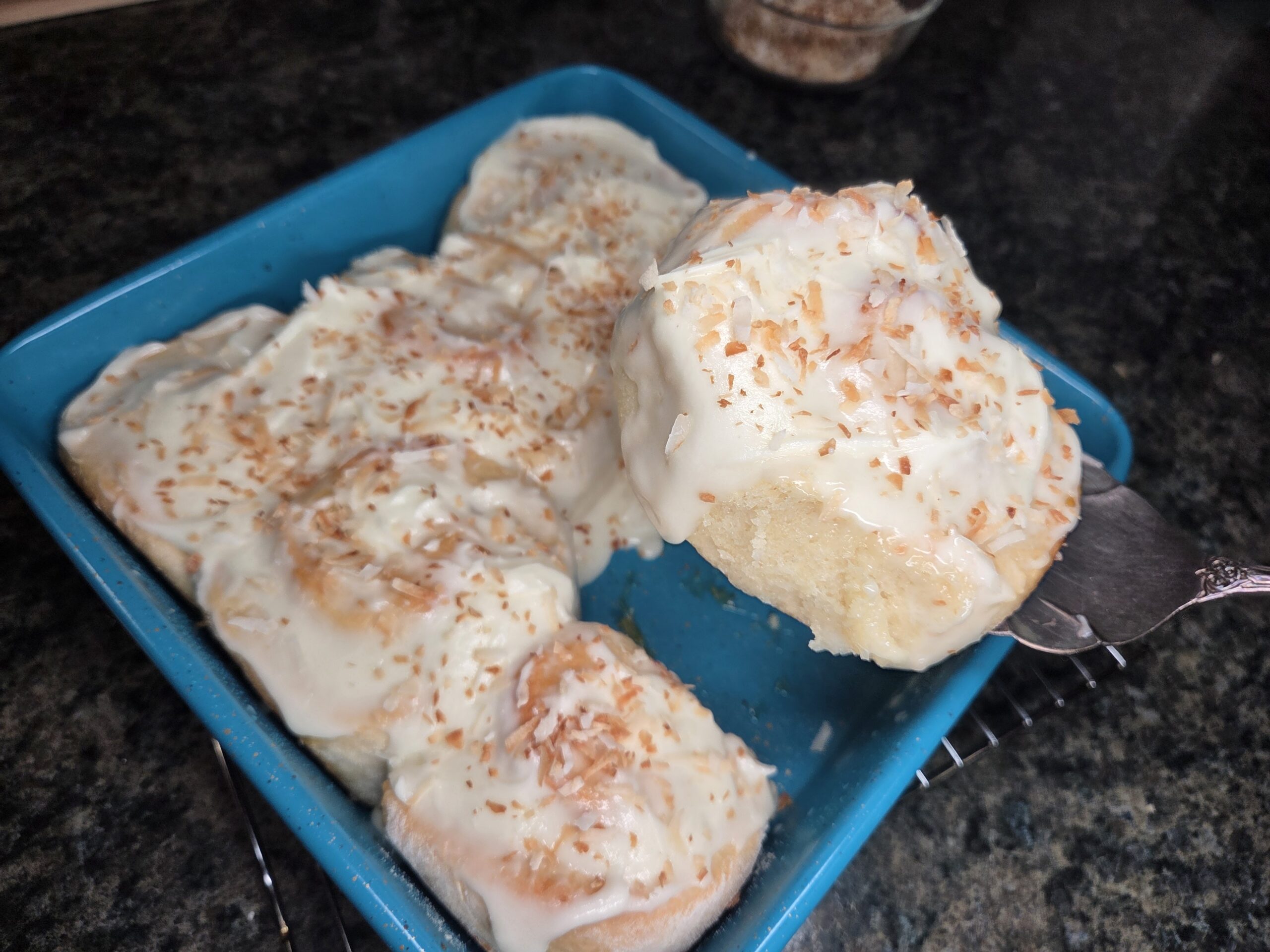 While the rolls are baking, toast 1/3 cup of shredded sweetened coconut in a dry, medium-sized pan over medium heat, stirring often until golden brown. Set aside.