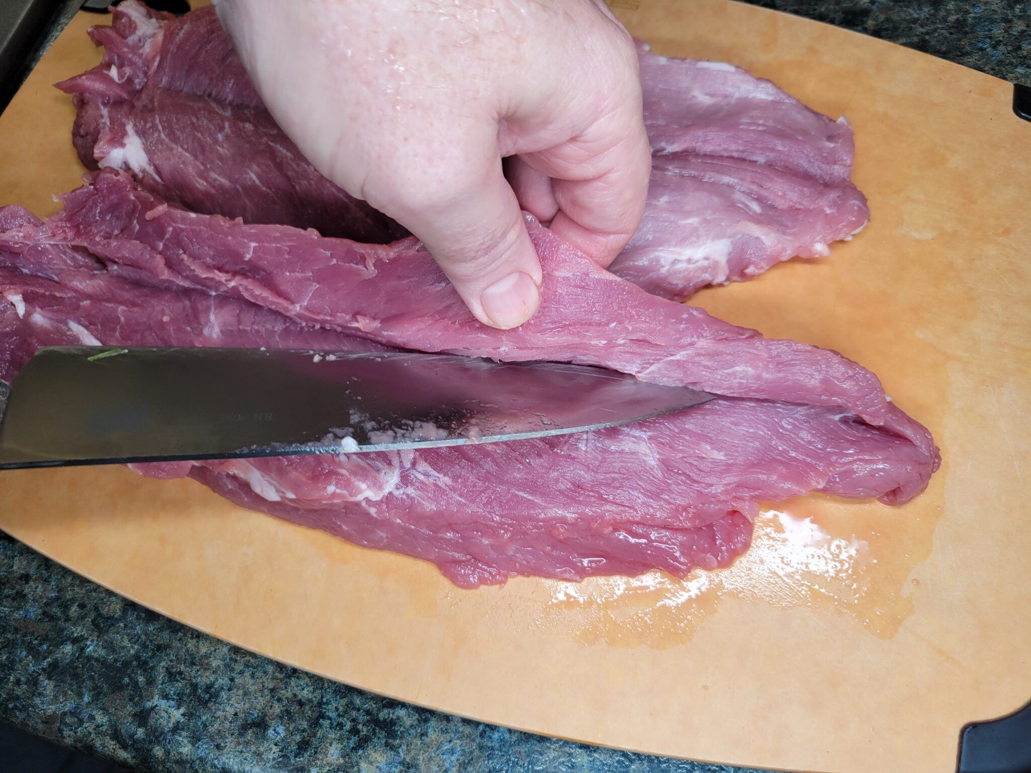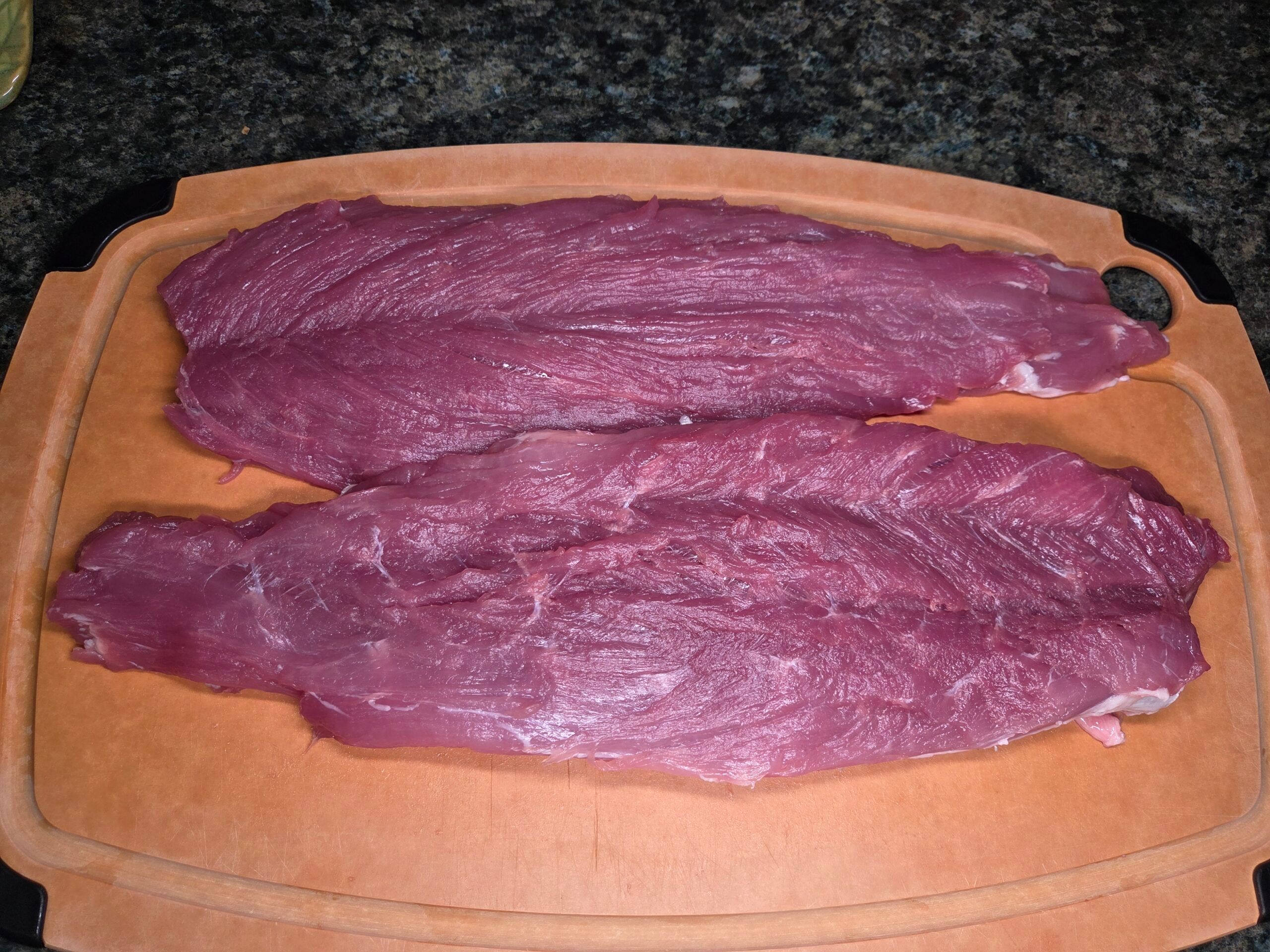 Carefully open the pork tenderloin package, saving all the juices for the gravy. Butterfly & Flatten: Carefully fillet the pork tenderloin lengthwise without cutting all the way through. Open it like a book. Cover with plastic wrap and pound to about 1/3 inch thick.