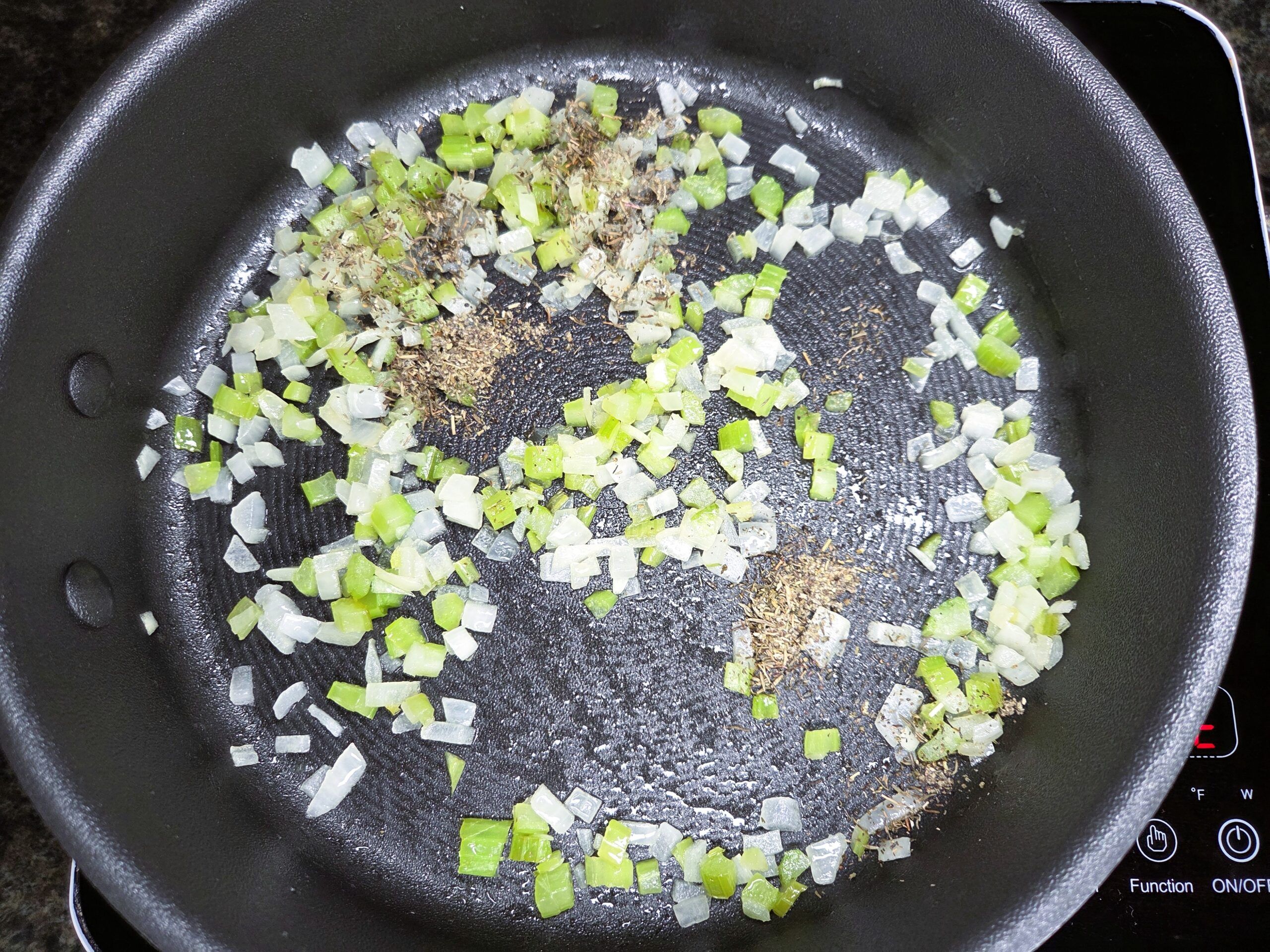 Preheat the oven to 350°F. Melt 2 tablespoons of butter in the same pan, then add 1/4 cup each of diced celery and yellow onion. Sauté until softened, about 4-5 minutes. Stir in 1/2 teaspoon of dried thyme leaves and 1 teaspoon of rubbed sage, cooking for another couple of minutes.