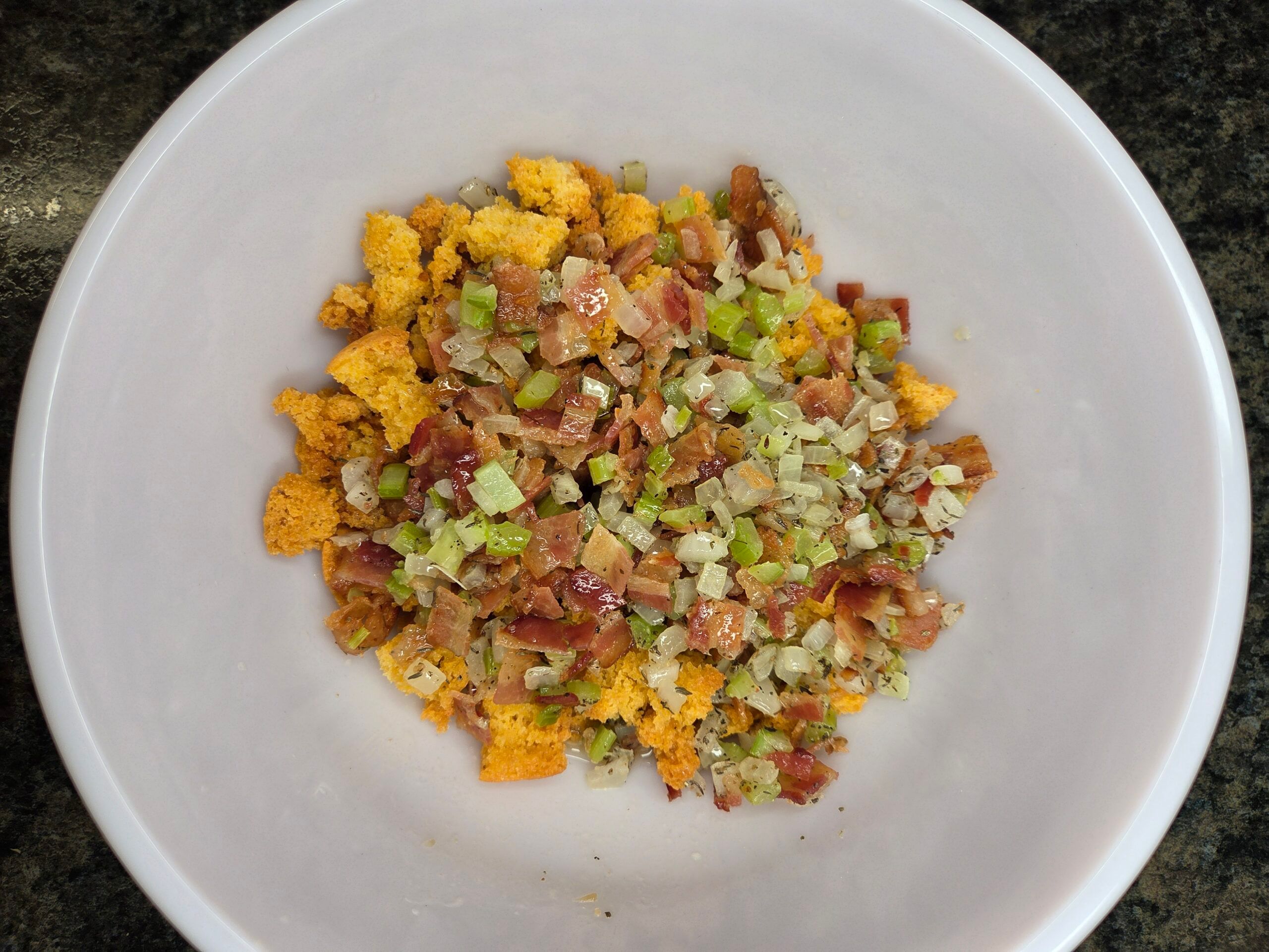 Combine the celery and onion mixture and chopped bacon in a large bowl with 1 cup of cubed, dried cornbread. Pour in 2 tablespoons of melted butter and 1/4 cup of vegetable broth, then stir everything together. Set the stuffing mixture aside.