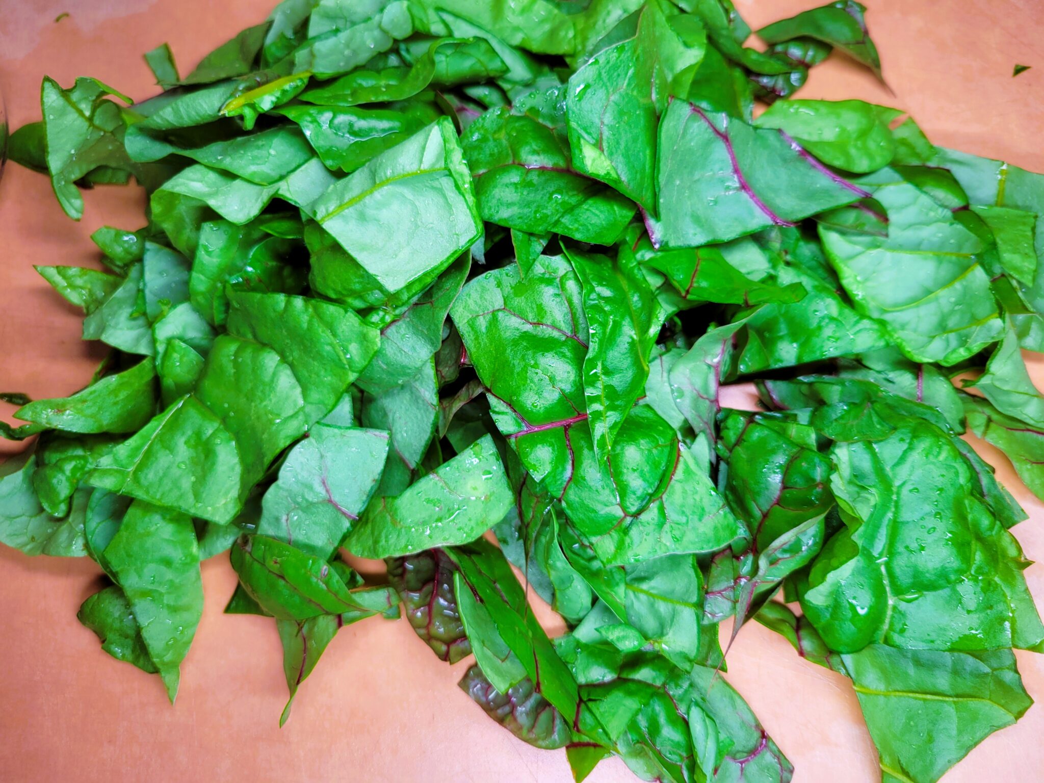 Wash the Swiss chard, separating the leaves from the stems. Dice the stems into 1/4-inch pieces and roughly chop the leaves.