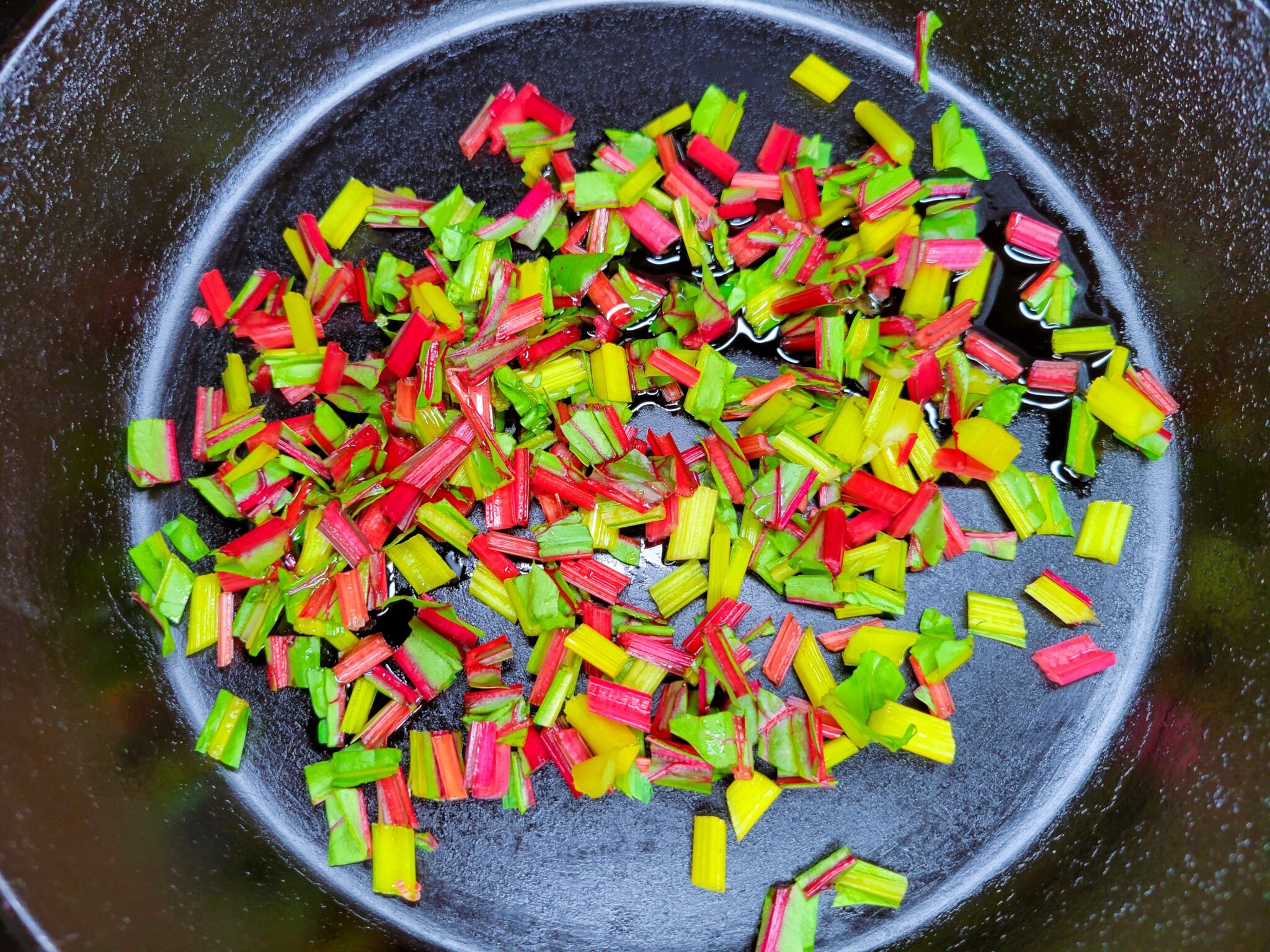 In an oven safe skillet add 1 tablespoon of olive oil on medium heat. Sauté the Swiss chard stems for 3-4 minutes.