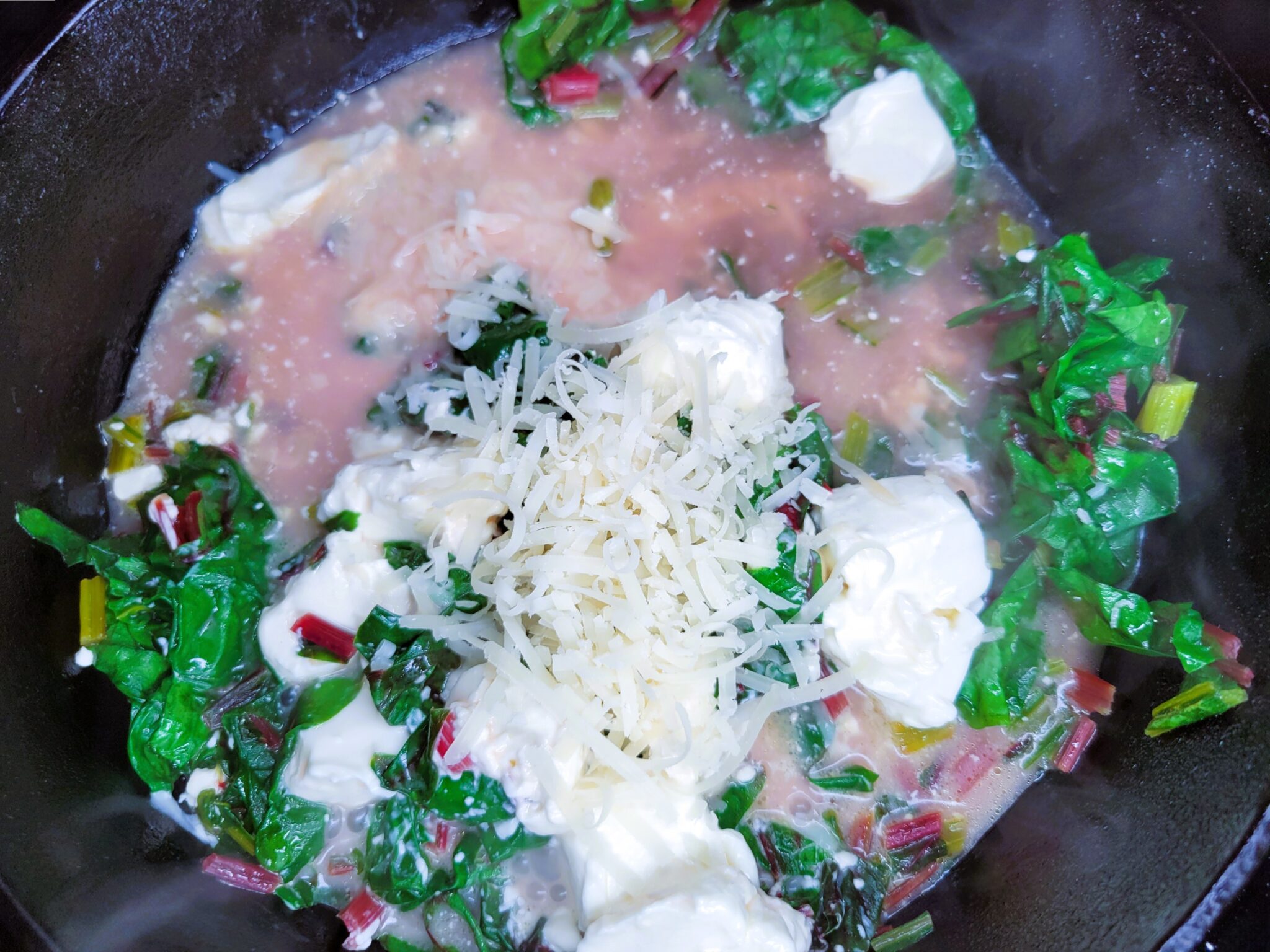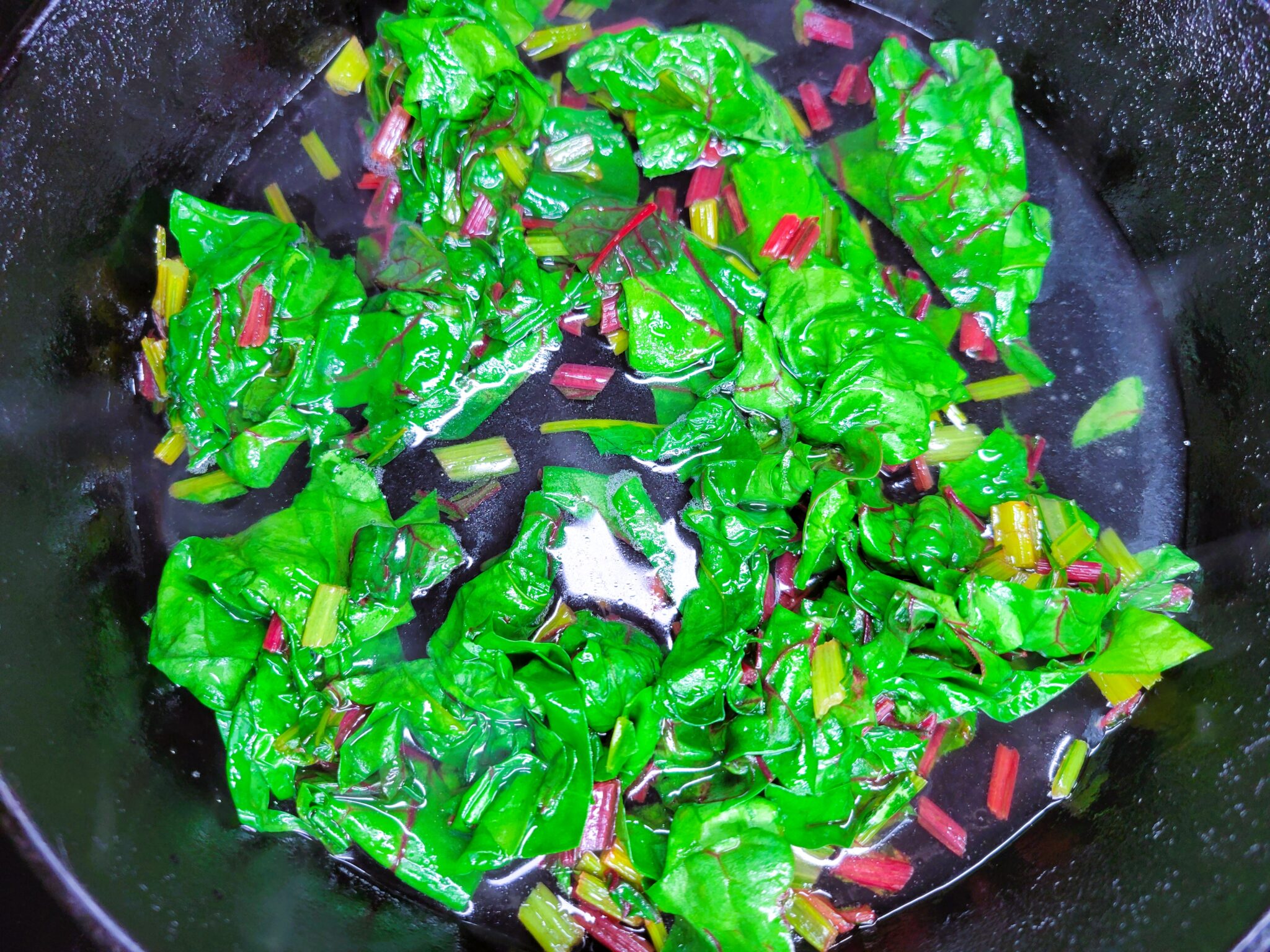 Next add in the Swiss chard leaves sauteing until leaves are wilted, about 2 minutes.