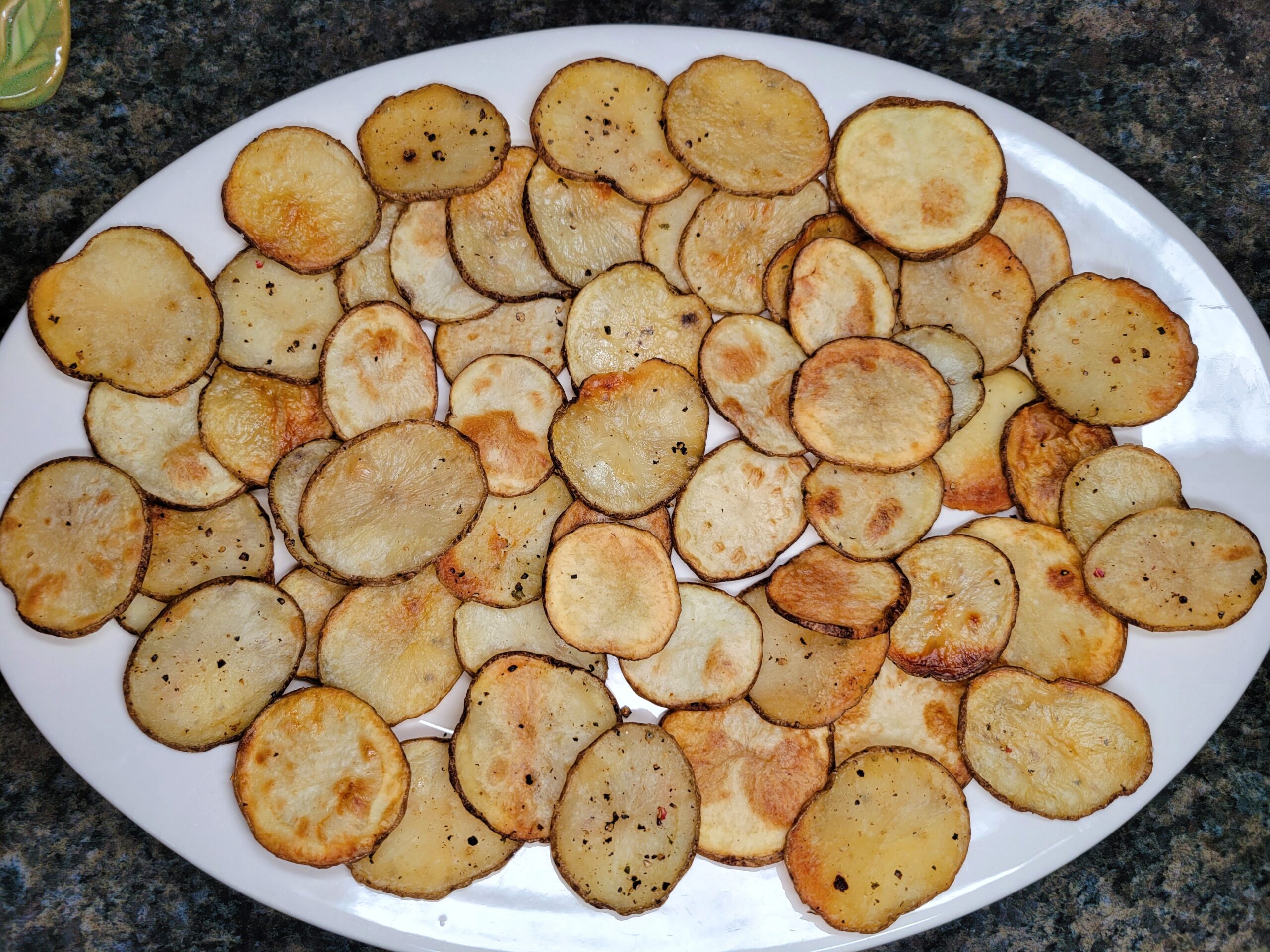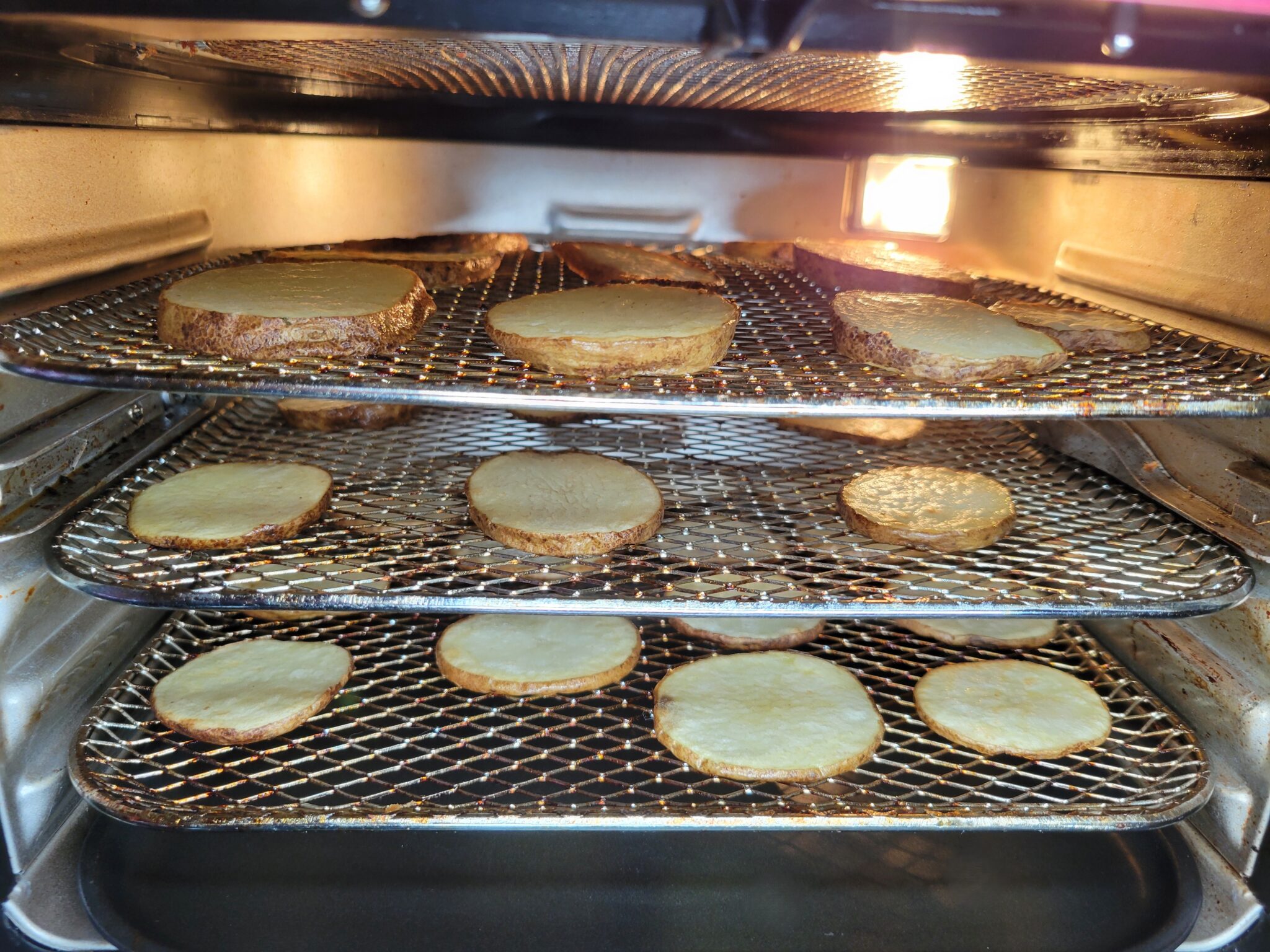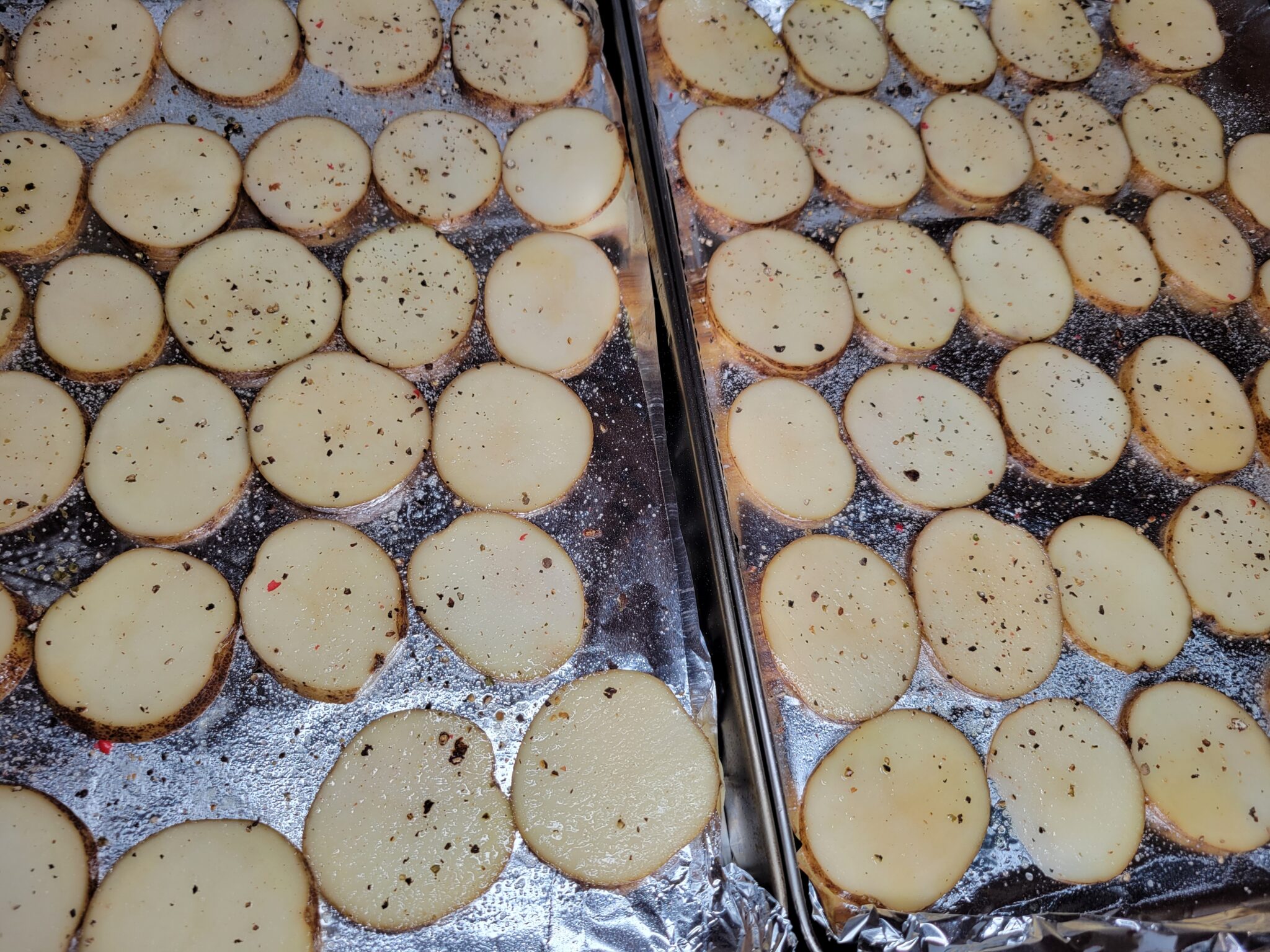Thinly slice the potatoes into even, thin rounds using either a sharp knife or a mandolin; consistent slices are essential for the best results and will cook more evenly.